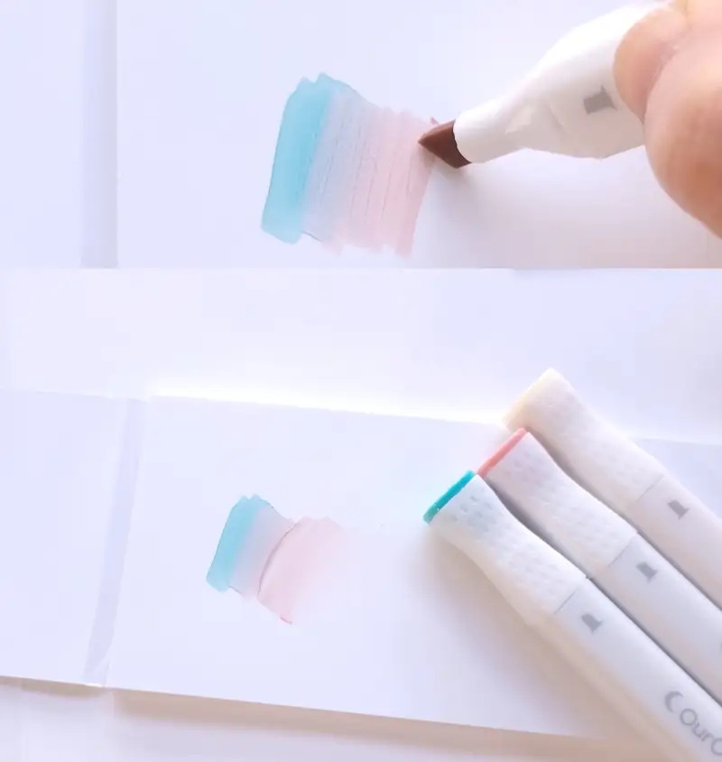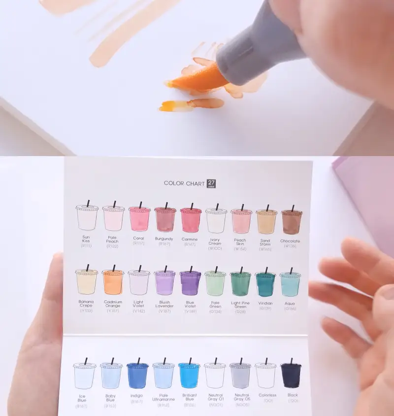 총 27색으로 양쪽에 다른모양의 닙이 표기되어있어요. 오른쪽 닙은 뾰족한 브러쉬타입이고 왼쪽은 사선의 각진 모양의 닙이예요. 닙이 적당히 말랑하고 끝이 잘 모아져있어서 경계를 맞춰 칠하기 편리해요. 그리고 칠해보니 좋은 잉크를 사용해서 색이 골고루 잘 섞이고 얼룩지지 않더라고요. 뭉침현상이 없었어요. 마커의 색은 대부분 너무 쨍하지 않고 은은하면서도 다른색과 자연스럽게 연결되는 컬러더라고요. 아이보리나 피치스킨 색도 너무 맑고 예뻤어요.