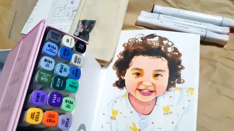 마카로 그린 첫 인물화! 마커는 생소해서 겁먹었는데 수채화처럼 투명하게 색칠할 수 있어서 아주아주 맘에 든다. 27색 색조합도 내 취향과 맞아서 반갑다. 유튜브 영상을 보니 블렌딩 전용 팔레트를 쓰면 더욱 풍부한 색을 만들 수 있다던데 골드손 아워컬러 트윈 브러쉬마카 세트에 들어 있어 경험할 수 있겠다. 기대된다. 참, 마카가 아래 종이에 물들지 않게 해주는 받침도 들어있다. 와!