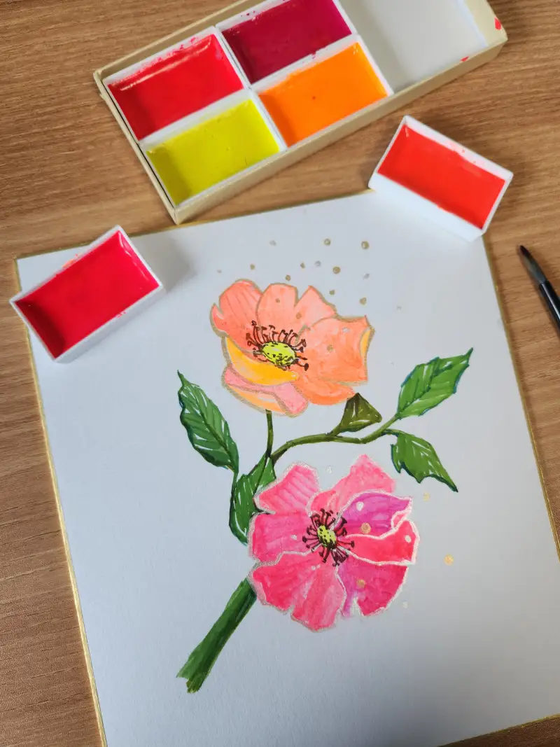 길상 안채 루미악센트 컬러는 형광색 기반을 한 새로운 물감이랍니다. 두방지에 꽃을 그려보았어요. 띤또레또보다 발색을 더 잘 머금고 유지함을 느꼈습니다.