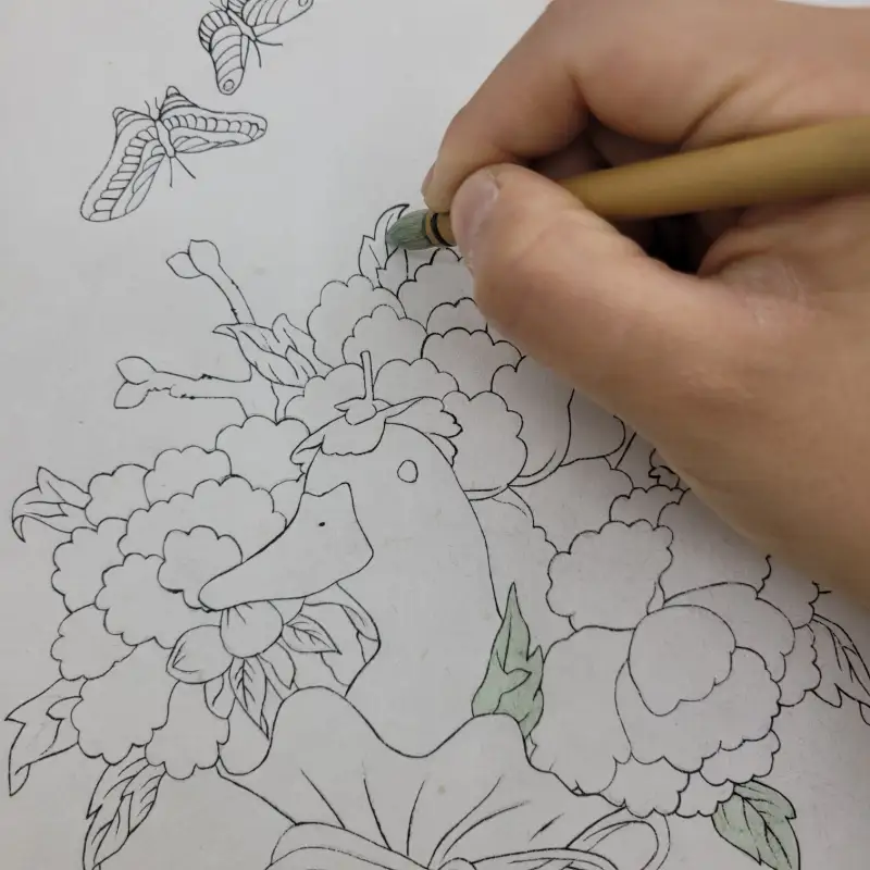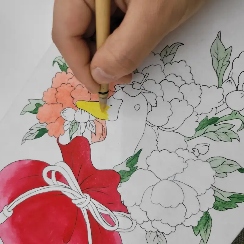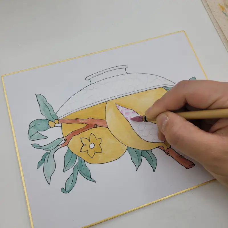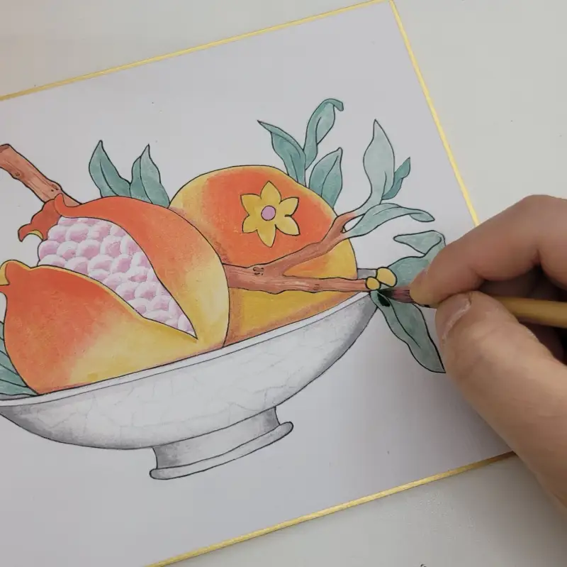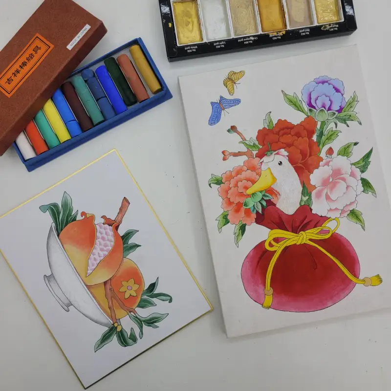 복주머니 민화 소품은 아교반수를 한 이합지 위에 그림을 그렸는데, 아교를 바른 화면에서 봉채의 블렌딩이 자연스럽고, 특히 바림을 할 때 훨씬 매끄럽게 색상이 이어지는 느낌이 들었습니다!