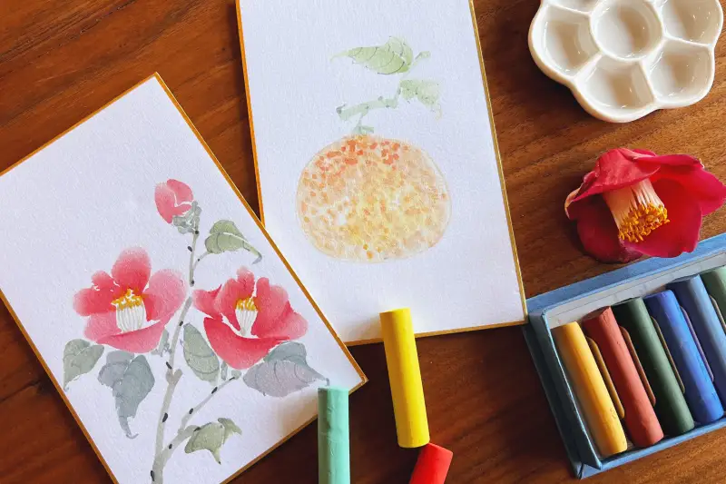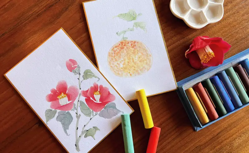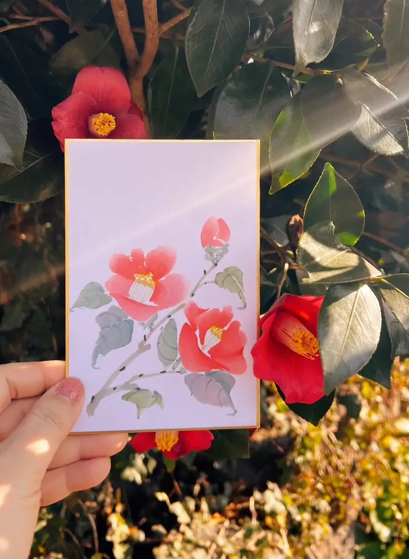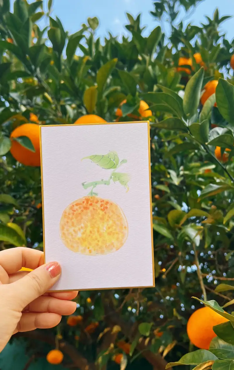 지금 제주는 동백과 귤이 한창이에요🏝️ 그래서 어떤걸 그려볼지 고민하다가 두방지에 길상 봉채 물감으로 동백꽃🌺과 감귤🍊을 그려보았습니다.