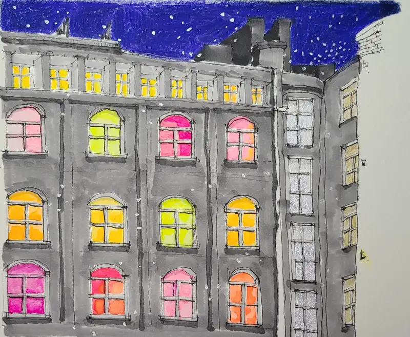 밤의 건물의 정면으로 보이는 밝은 창을
