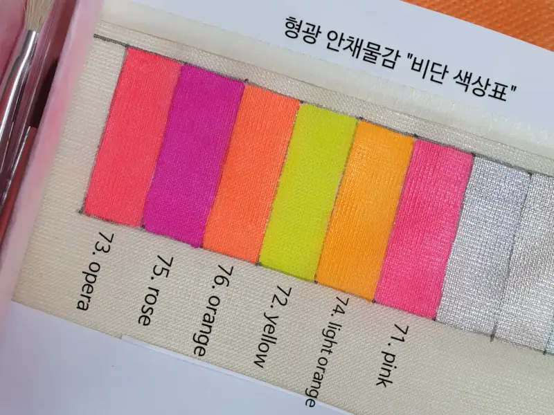 저는 비단에 작업을 하기 때문에 형광 안채물감의 비단 색상표도 만들어두었습니다. 색이 넘 화려하고 예쁘네요 ^^