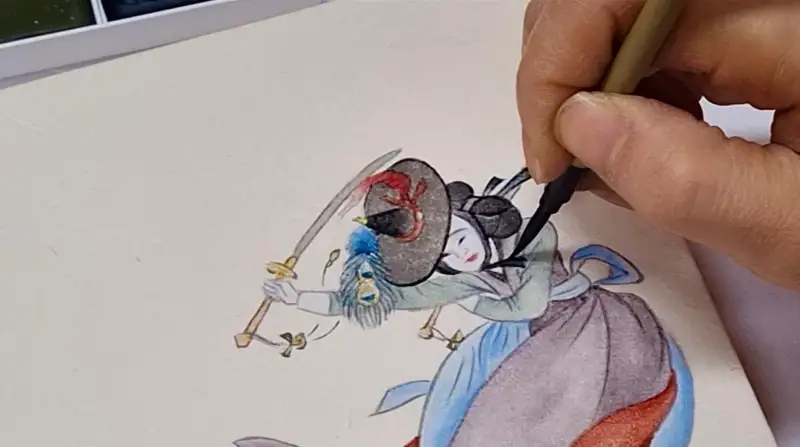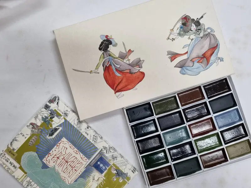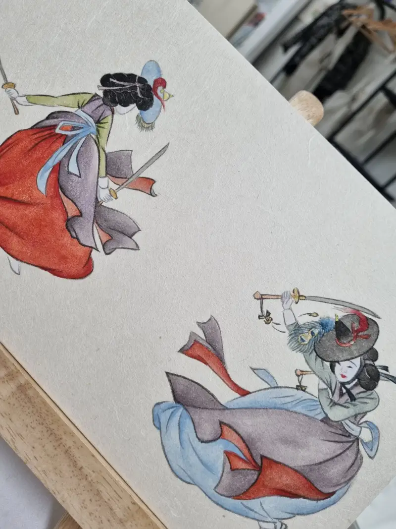 화방넷 체험단으로 선정되어 길상 채미먹 안채물감을 이용해서 풍속화의 대표적인 인물인 혜원 신윤복의 쌍검대무 를 그려보았어요.