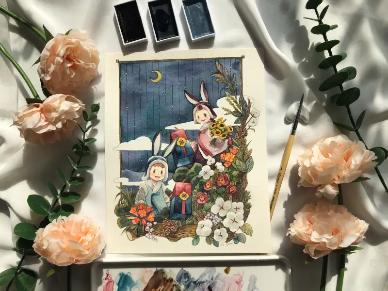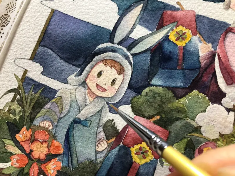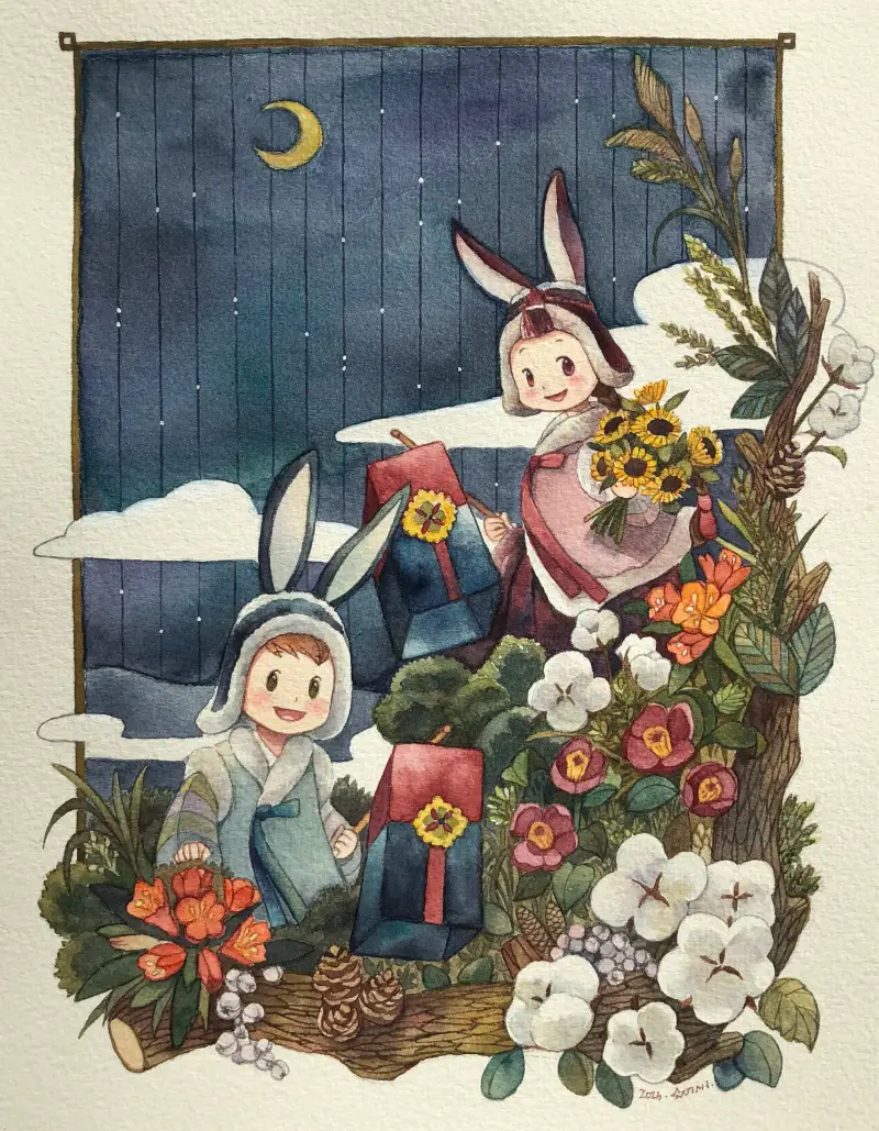 토끼 한복 소년, 소녀 일러스트를 그려보았어요. :-)