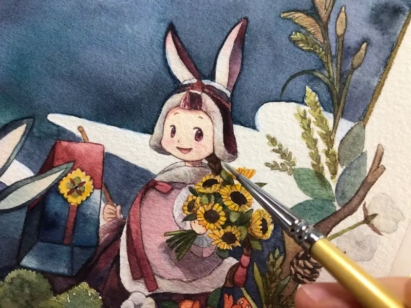 밝은 노란색과 주황색, 화이트등 은 수채화 물감으로,