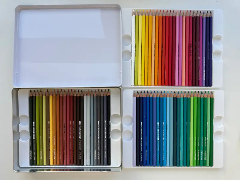 스테들러 소프트 색연필 72색 틴케이스는 부드럽게 발색되어 꽃잎의 미묘한 색 변화나 잎맥의 섬세한 질감을 표현하기 좋아요. 🌷