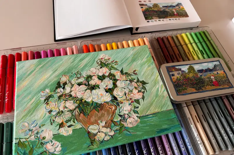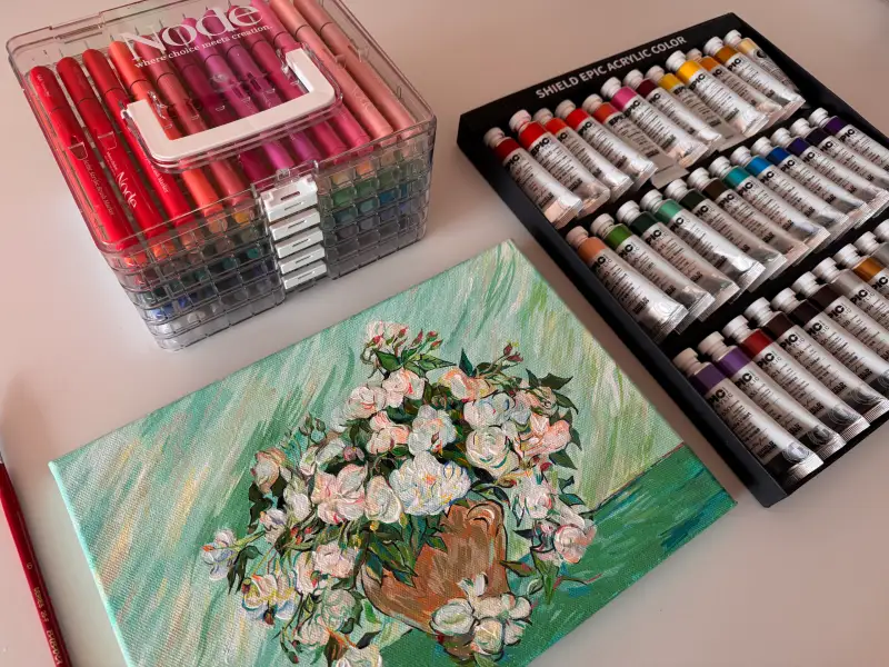 일단 저는 마카가 처음이라 뭘 그려야할까? 고민하며 발색표를 만들다가 노드 아크릴마카 에메랄드그린, 민트 계열이 고흐의 분홍장미가 있는 꽃병을 떠올리게 만드는 예쁜 색감이라 ☺️ 에라캔버스 a4사이즈에 그려보았어요.
