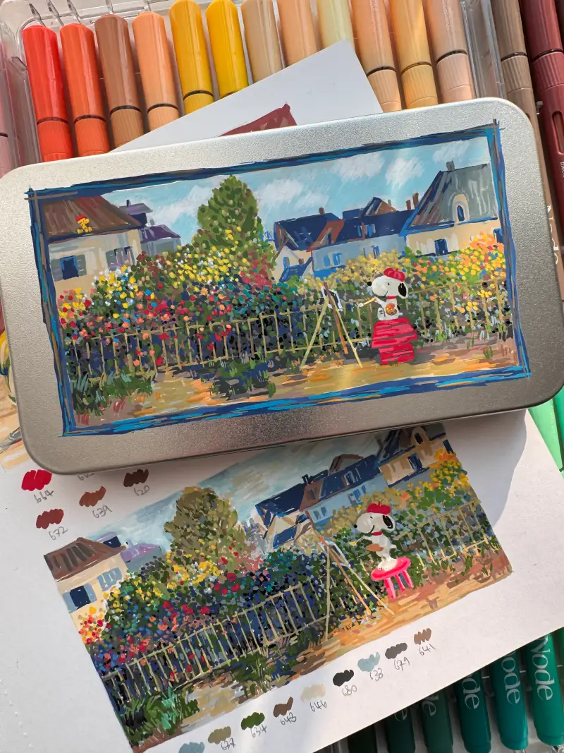 마지막으로는 메탈 틴케이스에 제가 좋아하는 르누아르 그림을 스누피 팬아트 버전으로 그려보았어요.