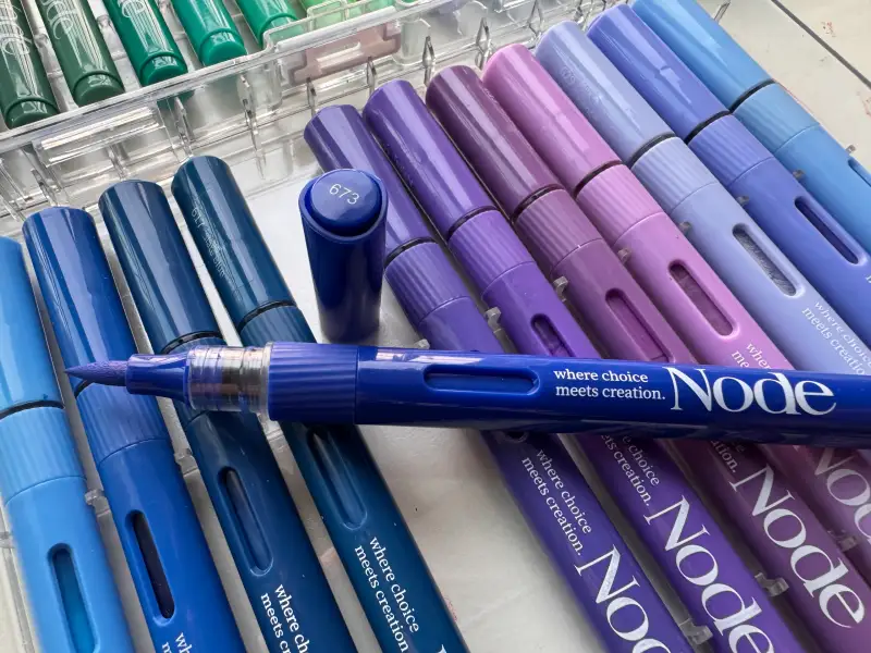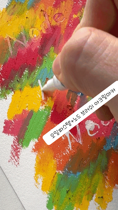 두텁게 그려진 오일파스텔 위에 색연필로 선을 그으면 오일파스텔이 패이고, 펜촉형 마카는 잉크가 왈칵 나와서 불편할 때가 많았는데 노드 아크릴마카는 색상도 다양하고 브러쉬형태가 사용하기 편할 것 같아요 😊