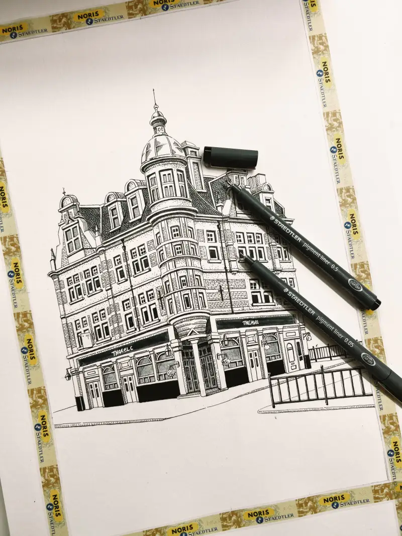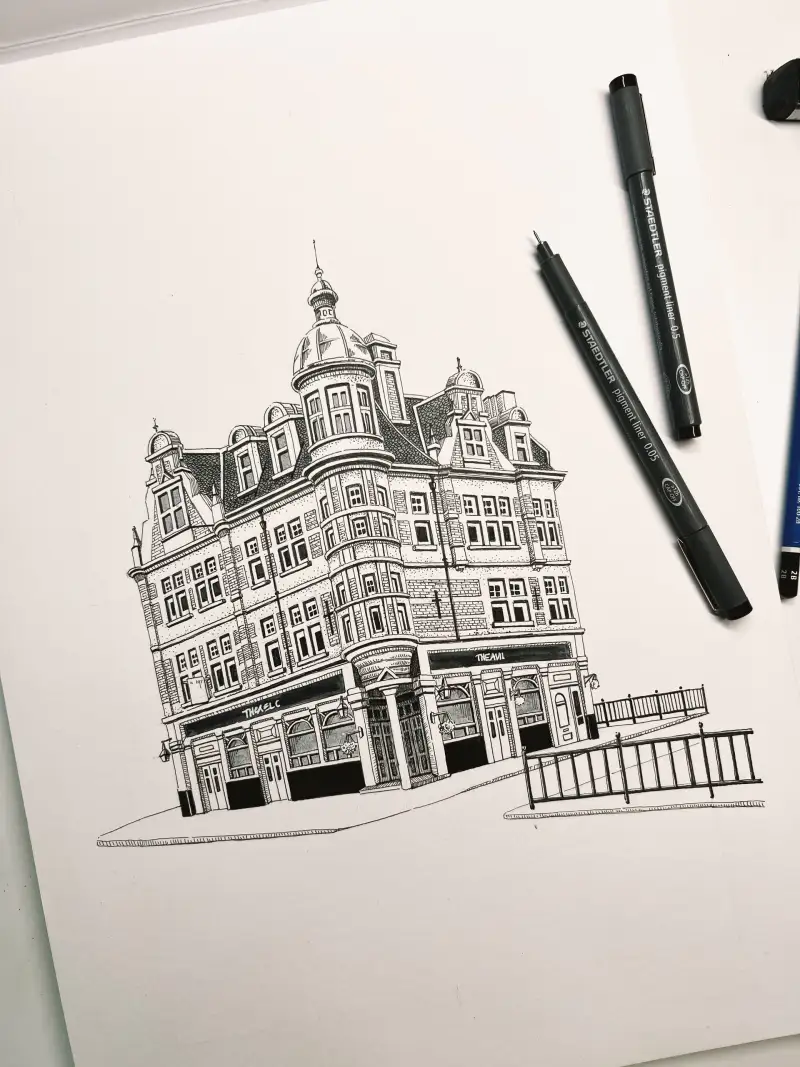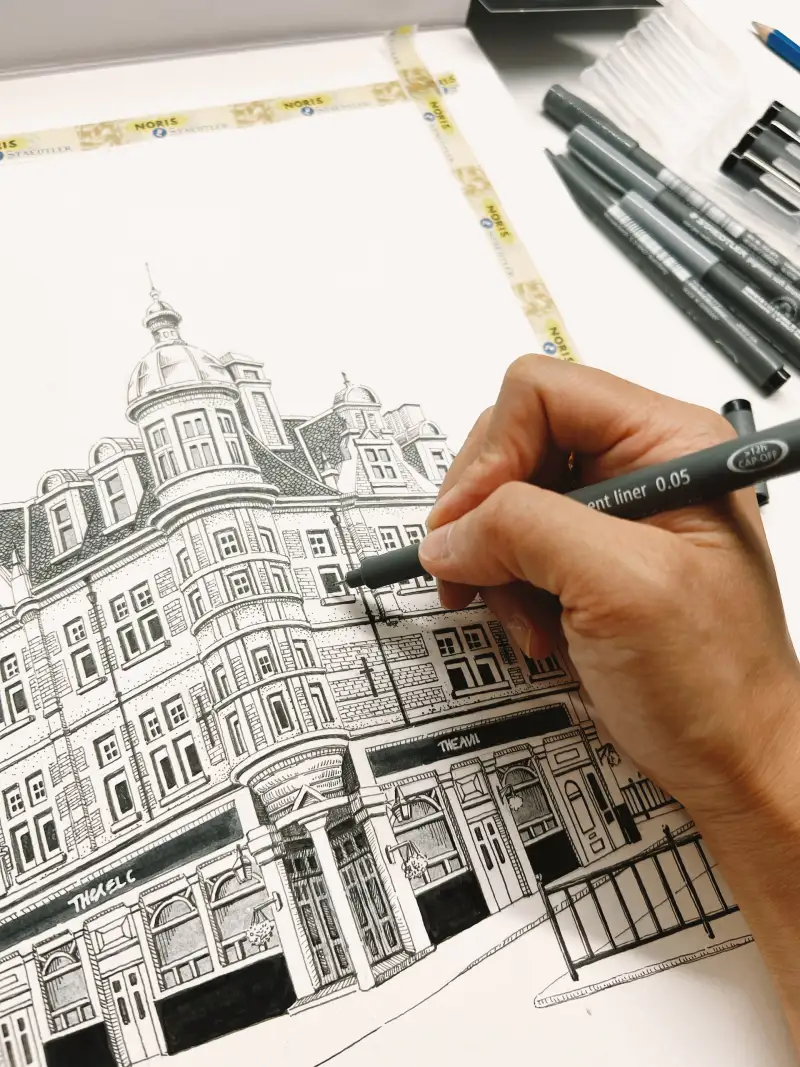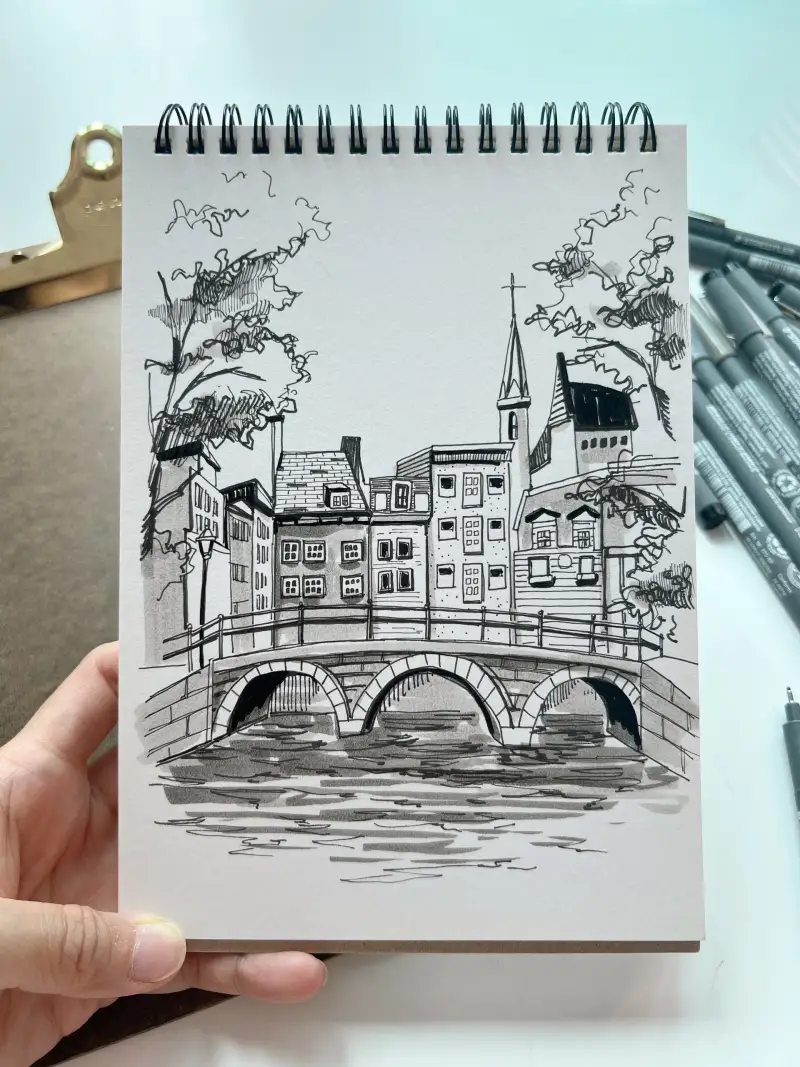 펜화 특성상 여러번 중첩되어 쌓는 과정에서 타브랜드와 비교하였을때 훨씬더 깊이감이 있고 농도가 짙은 블랙이 발색되어 밀도가 높은 느낌을 받아요 .먹을 예로 들었을때 피그먼트 라이너는 먹을 더 많이 갈아놓은 느낌이랄까요