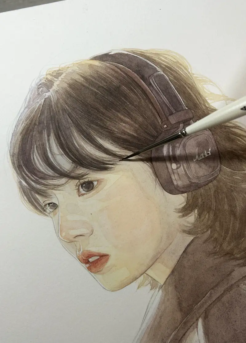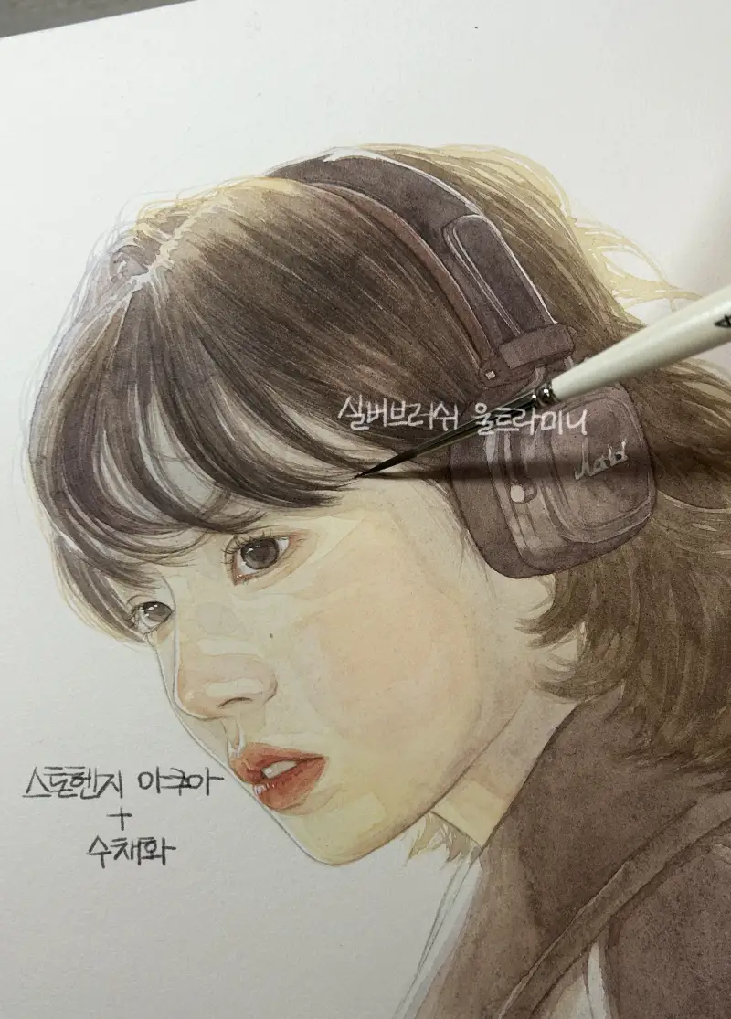 최고급 인조모로 제작해 아크릴과 수채화 모두에 적합한 붓이라고 합니다! 저는 4호 붓을 수채화 할 때 머리카락, 속눈썹 같은 세밀한 묘사에 사용해 보았어요. 완전 세필붓이 아닌데도 붓 끝이 엄청 뾰족하게 제작이 되어서 머리카락 한올 한올 그리는데도 아주 얇고 정확하게 그릴 수 있었어요.