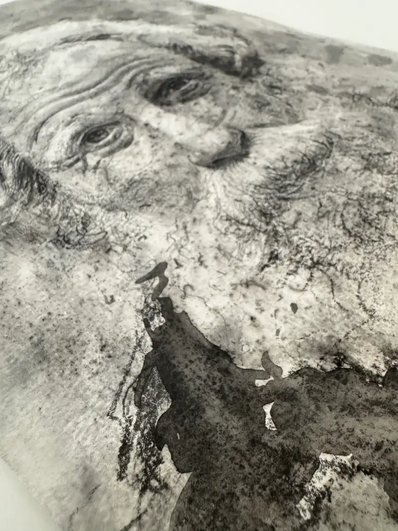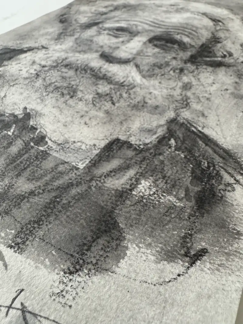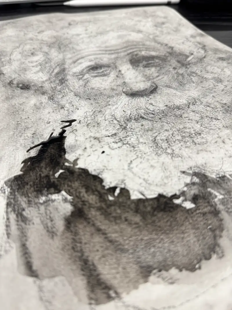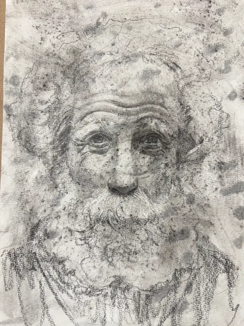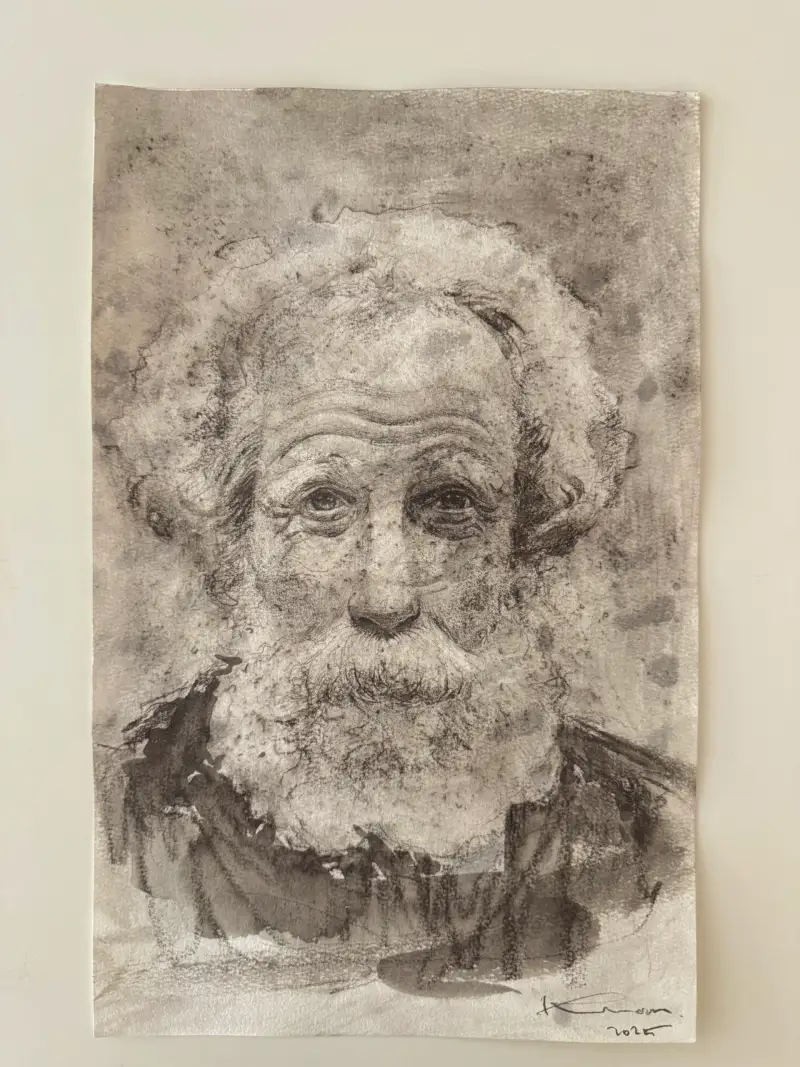 심을 얇게 갈아서 수채화지에 퍼트린후 분무기를 쏘았을때 만들어지는 그 불규칙적이고 우연적인 패턴들의 빈티지함이 아름답다고 느껴졌습니다. 거칠기도 하면서 낡은것 같기도 한 그 밑바탕에 노인을 그리면 잘 어울릴것 같아 노인을 스케치합니다.