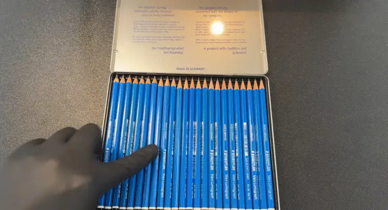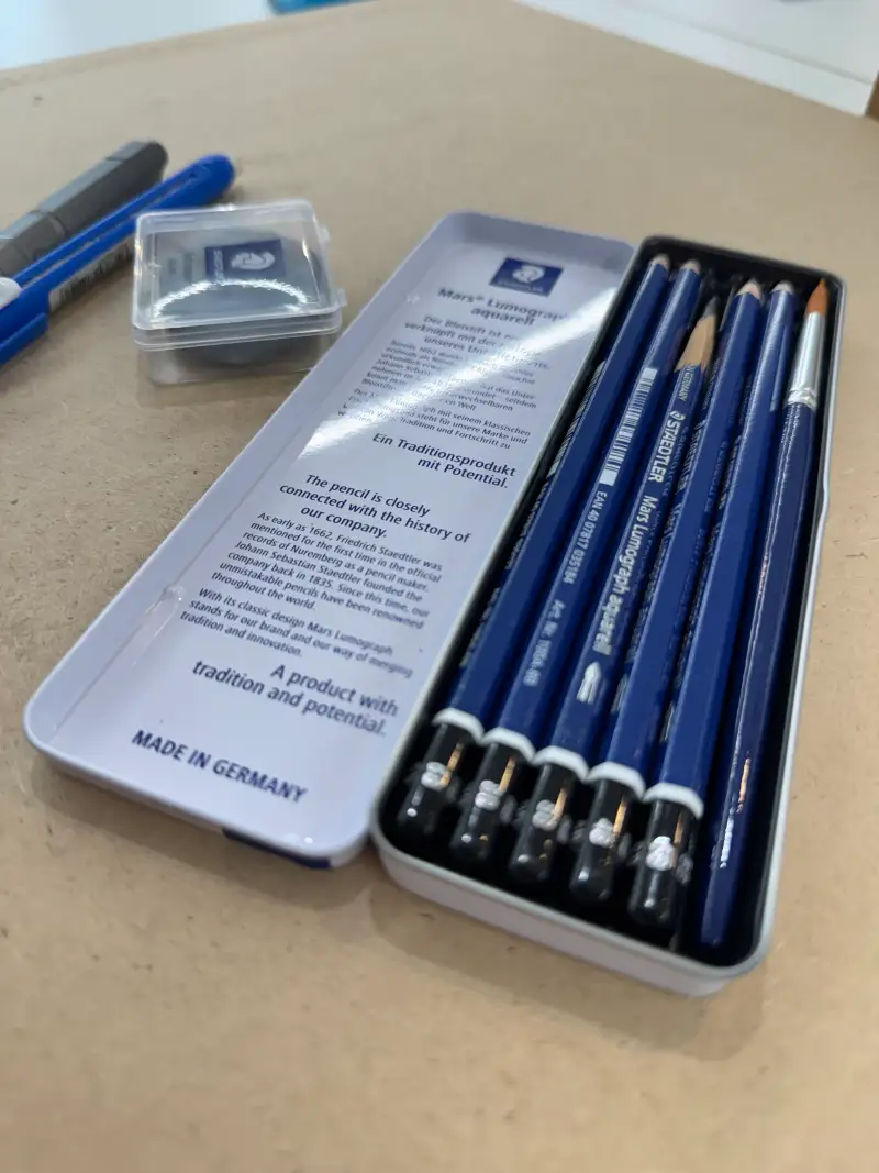 먼저 소개해드릴 연필은 Staedtler Mars Lumograph aquarell 연필입니다. 가장 큰 특징은 수채표현이 가능하다는 건데요,알루미늄 케이스에는 4B,6B,8B 연필과 붓이 동봉되어 있어요!