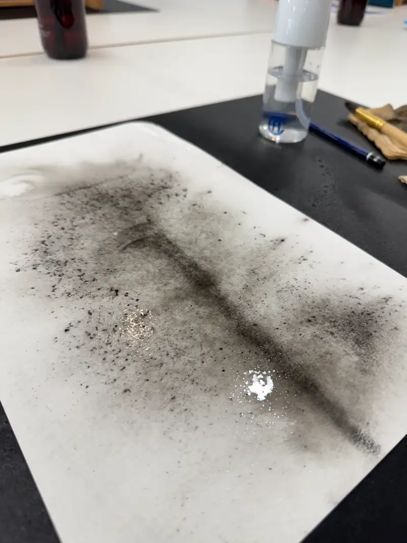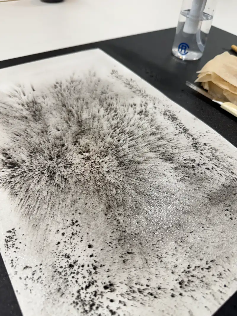 여섯번째! 켄트지에 수채연필을 가루내어 퍼트리고 분무기를 분사한 후 일정 건조뒤 물티슈로 불규칙적인 패턴 만들기