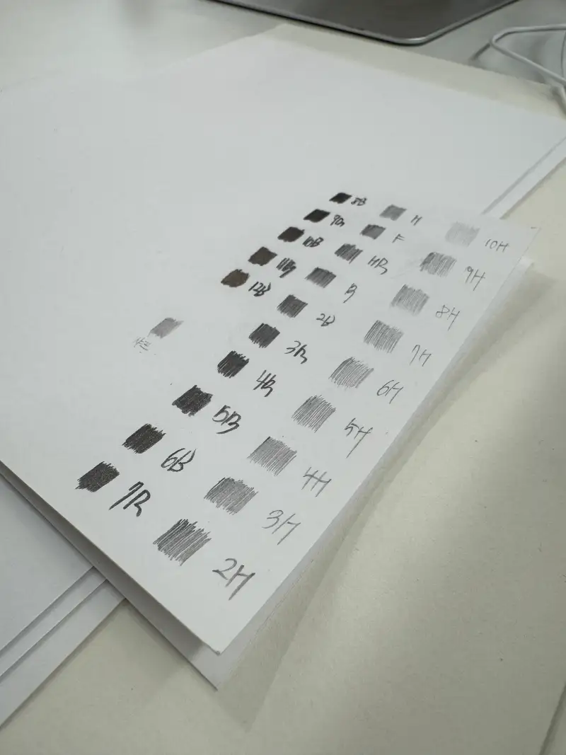 일단 가장 연한 10H부터 가장 어두운 12B까지 빈종이에 테스트를 해보았습니다. H심들은 정말 연했는데 화지에 테스트를 해보니 주의해야 할것이 발색이 어느정도 눈에 보이는 정도가 되려면 화지에 데미지를 줄 수도 있다는것! 주의하셔야해요.