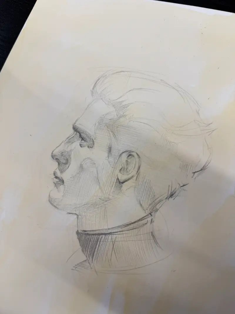 멋진 남자의 측면입니다. 켄트지에 수채물감으로 약간 브라운계열의 칠을 밑작업 한 상태에서 드로잉을 해봤어요. 위에 여성그림보다는 조금 더 날카롭게 연필을 썼습니다.