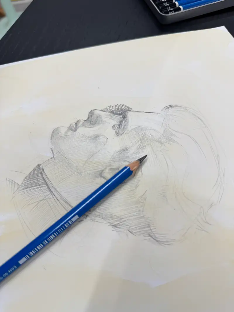 이목구비에 미세한 각도와 모양들을 조금 더 잡아주고 이번엔 진짜 스탑! 할게요.  이제 어두운 연필들을 이용해서 느낌들을 살려볼까요?