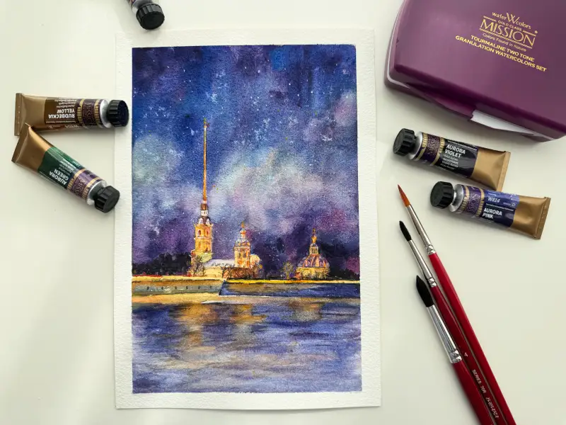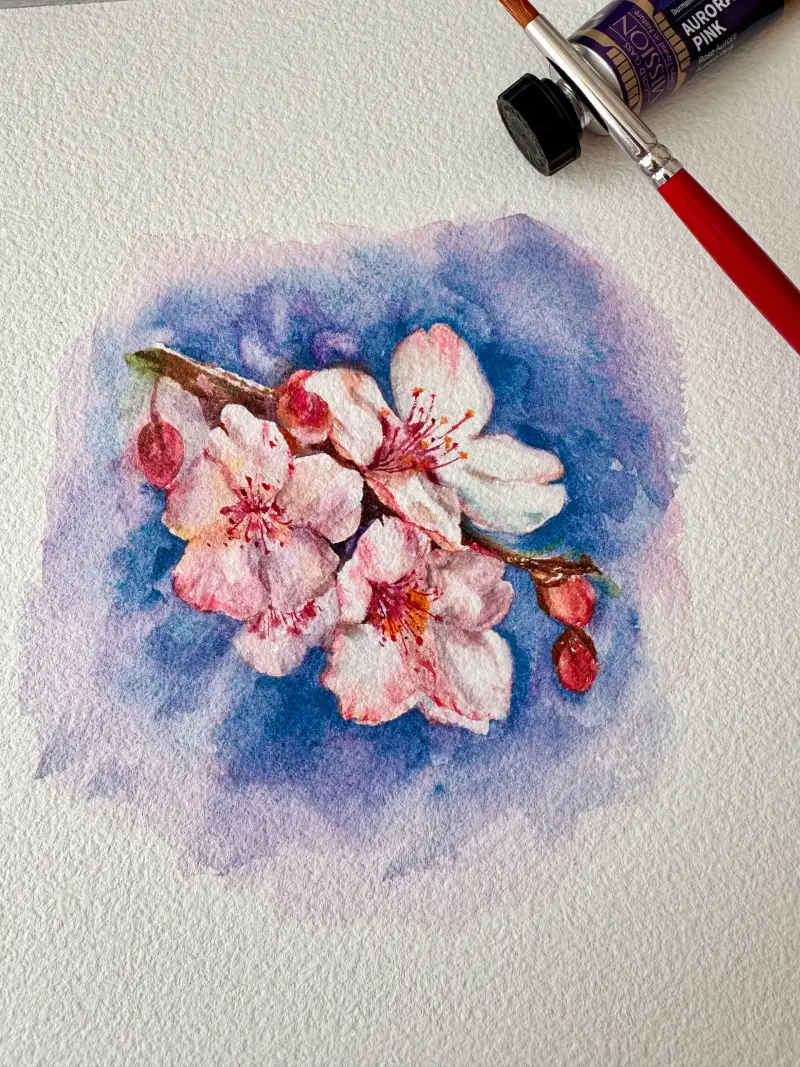 미젤로 투톤 그래뉼레이션 봄세트 수채물감으로 벚꽃을 그려봤어요! 일반 수채화물감으로 꽃을 그리고 미젤로 투톤 오로라핑크로 배경을 표현해줬어요.