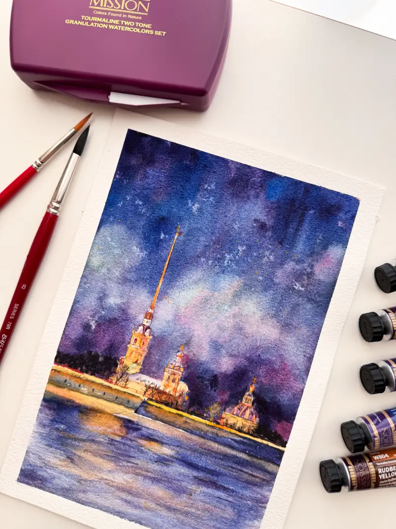 미젤로 투톤 그래뉼레이션 물감으로 그리며 느낀건 물감자체가 다채로운 색감을 가지고 있으니 수채용지 마르기전에 급하게 다른색 레이어링하고 그라데이션할 필요없어 좋았어요 ☺️