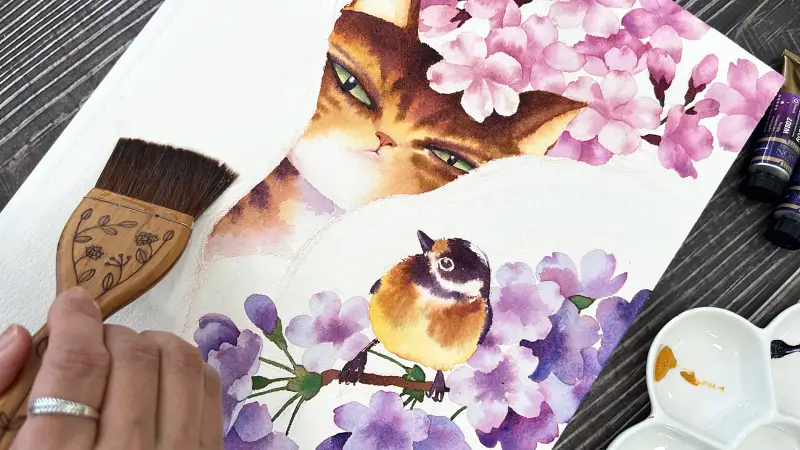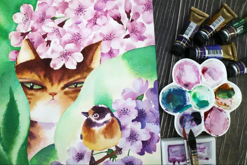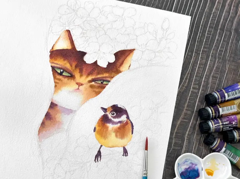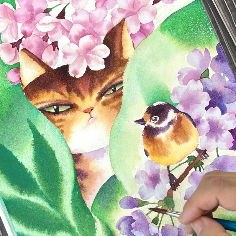 고양이와 곤줄박이는 주로 Rudbeckia Yellow를 사용하고 Rose Magenta와 Aurora Violet를 믹스해서 진하게 색을 올려줬습니다.