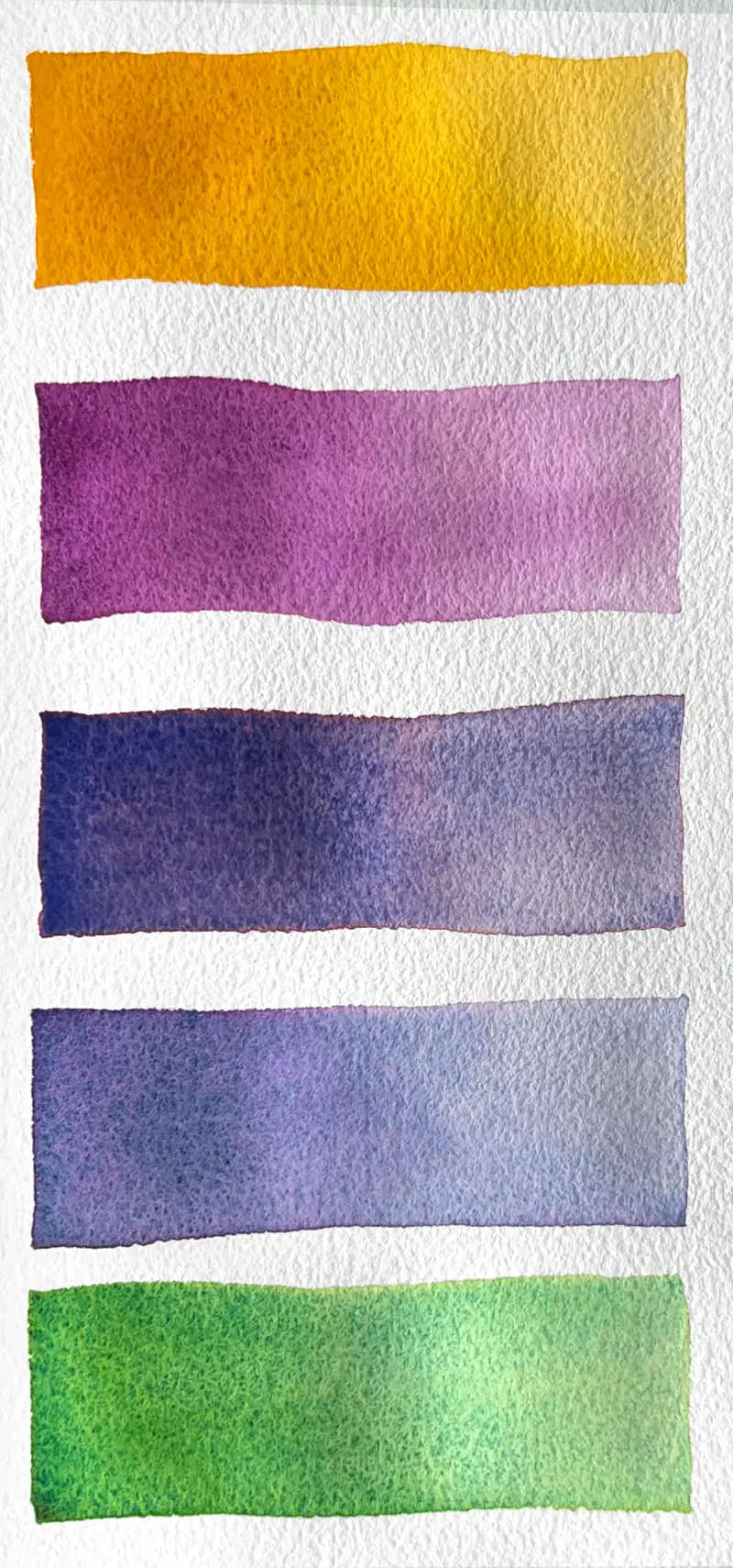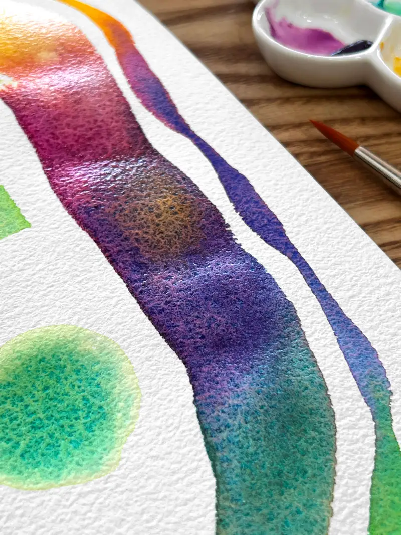 수채물감은 보통 물이 마르면 채도가 내려가는데 미젤로 투톤그래뉼레이션 물감은 정말 선명한 색을 보여줍니다.종이에 물 번짐도 매우~좋고 물감이 스미는 느낌도 도 뛰어나고 아름답습니다.워시로 고르게 칠하는 것보다 거칠고 투박하게 붓질을 하면 투톤의 효과가 더 뚜렷해 투톤 그래뉼레이션 물감은 질감이 거친 황목에 적합하단 생각입니다.