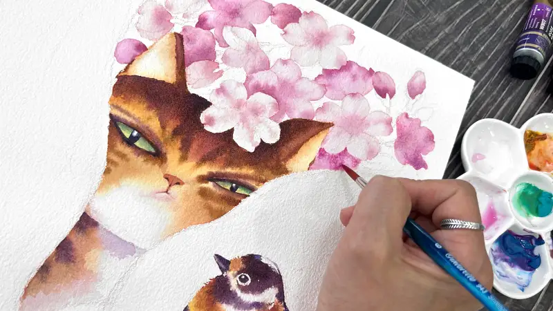 냥이 주변에는 Rose Magenta로 가득 꽃을 그리고, 곤줄박이 주변은 Aurora Pink를 주로 사용했습니다.