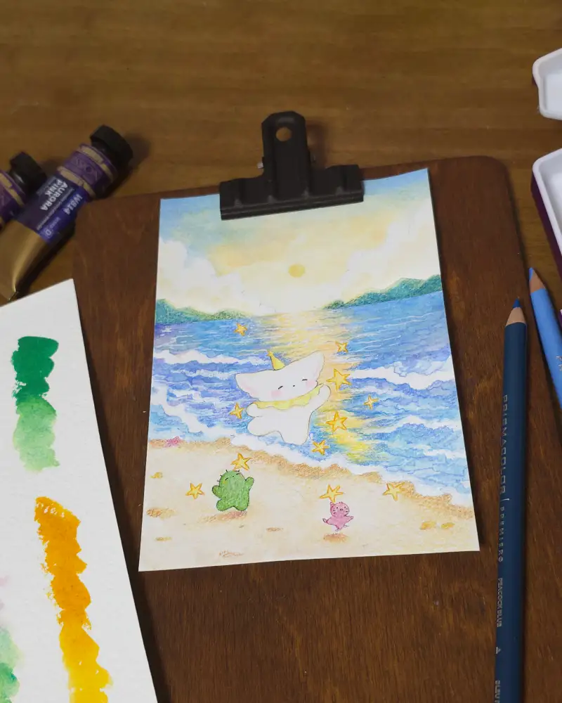 일러스트의 바다를 미젤로 물감으로 색칠해 보았는데요! 푸른 색과 보라색이 섞여 오묘하고 예쁘더라구요.