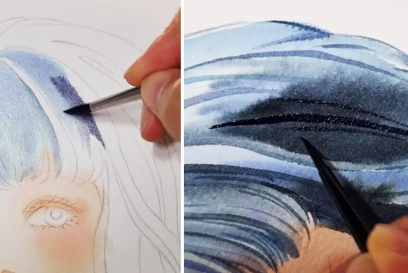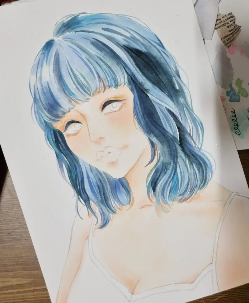 피부 밑색 작업후 머리결 작업도 빠르게 진행합니다. 블루로 베이스깔고 보라색과 블랙등의 컬러를 야주 약간씩만 배합하여 다채로운 커러를 표현해봤어요