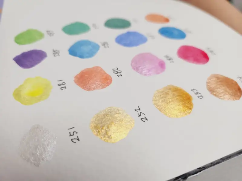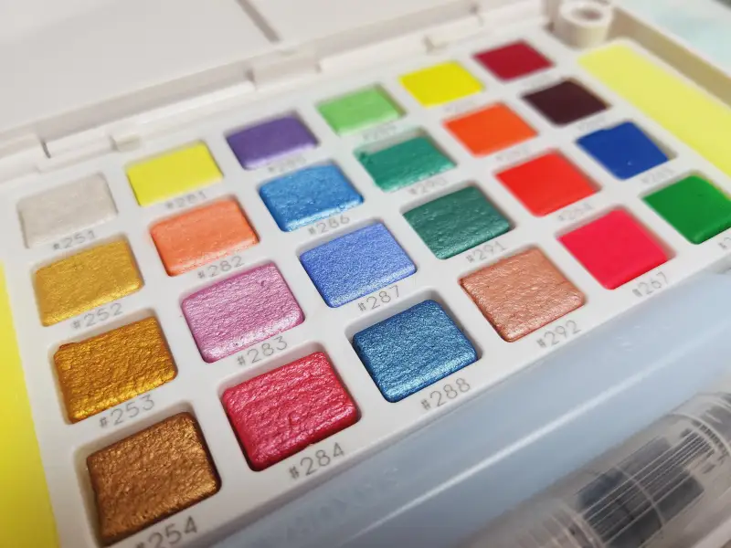 24색 모두 사용해본 결과 펄감 충만하고, 형광컬러도 아주 쨍한 형광컬러로 발색이 잘 되네요. 워터브러시를 꾹 눌러 고체물감 위에 물을 한방울 툭!떨어트린 후, 문지르면 색이 잘 녹아납니다.