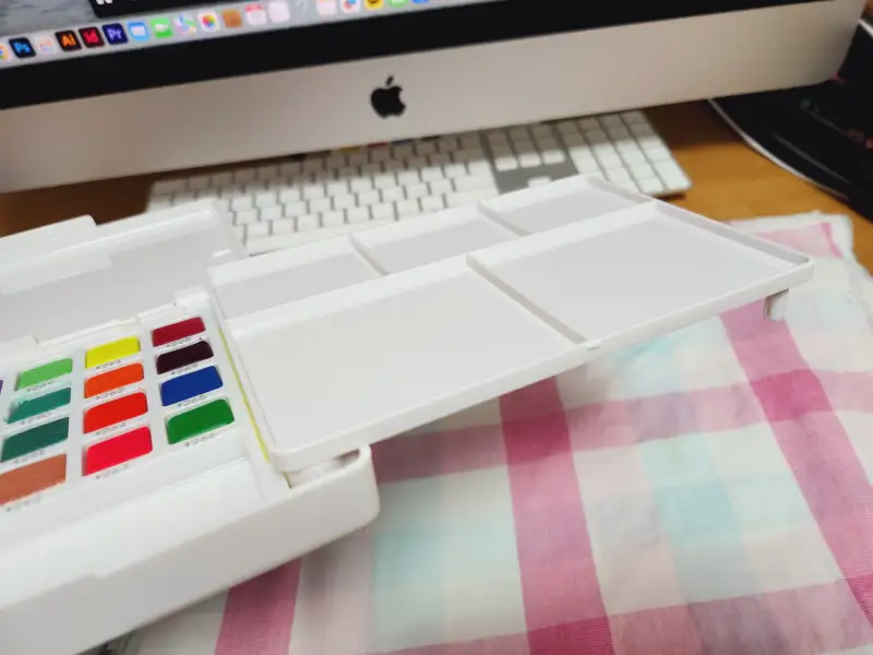 케이스는 하얀 플라스틱 재질이다보니 팔렛트에 묻은 물감은 씻어내어도 색이 베이긴 해요.