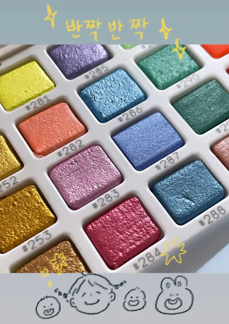 사각 고체물감들이 컴펙트한 사이즈로 들어가있고, 매우 반짝였어요