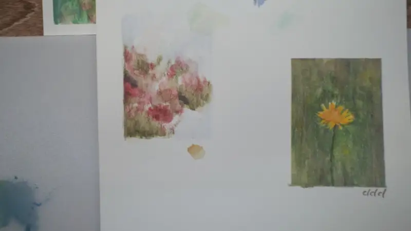 발색 표 만들고, 재료와 친해지기 위해 작은 그림 두 조각 그리니, 너무 재밌더라고요!