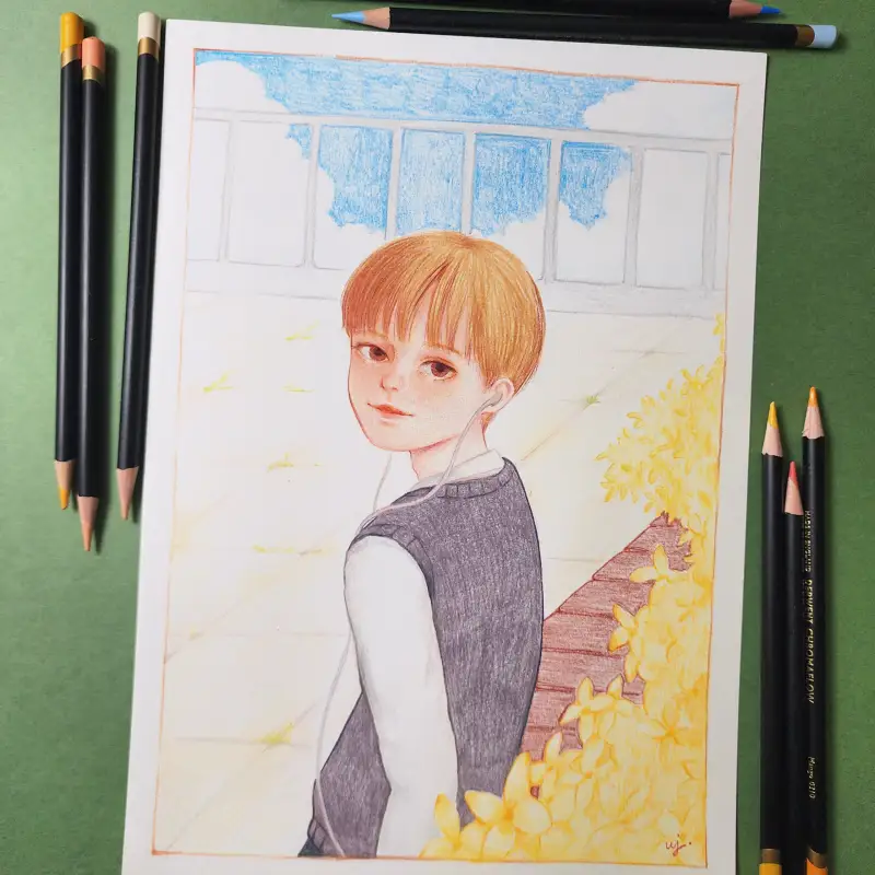 발색이 연한 만큼 종이의 질감이 잘 느껴지고 색연필 특유의 아날로그 감성을 느낄 수 있는 그림이 그려져요.
