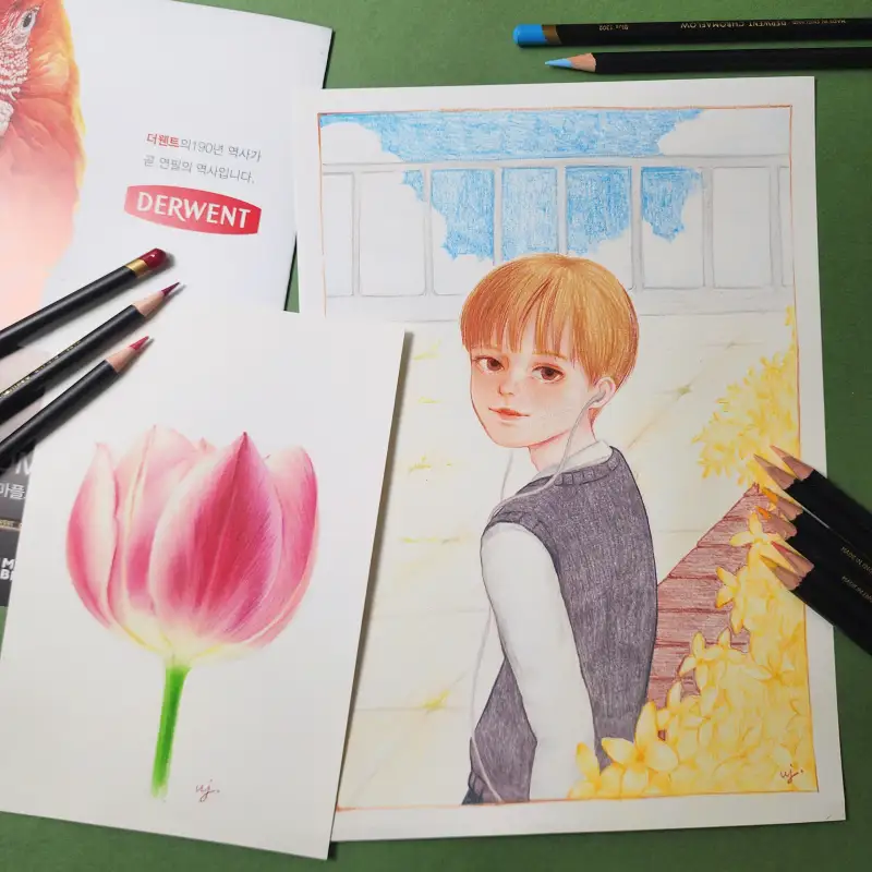 평소에 유성색연필의 미끌거리는 듯한 느낌을 안좋아해서 수성 색연필을 좋아하는데요, 더웬트 크로마플로우 색연필은 수성색연필을 칠하는 듯한 느낌을 받았습니다. 종이에 굉장히 부드럽게 써져요. 그래서 딱딱한 타사 제품대비 가루날림은 좀 있는 편이지만 색연필그림은 원래 가루 치워가며 그리는 그림이니까 이정도는 당연히 감수해야죠ㅎㅎ