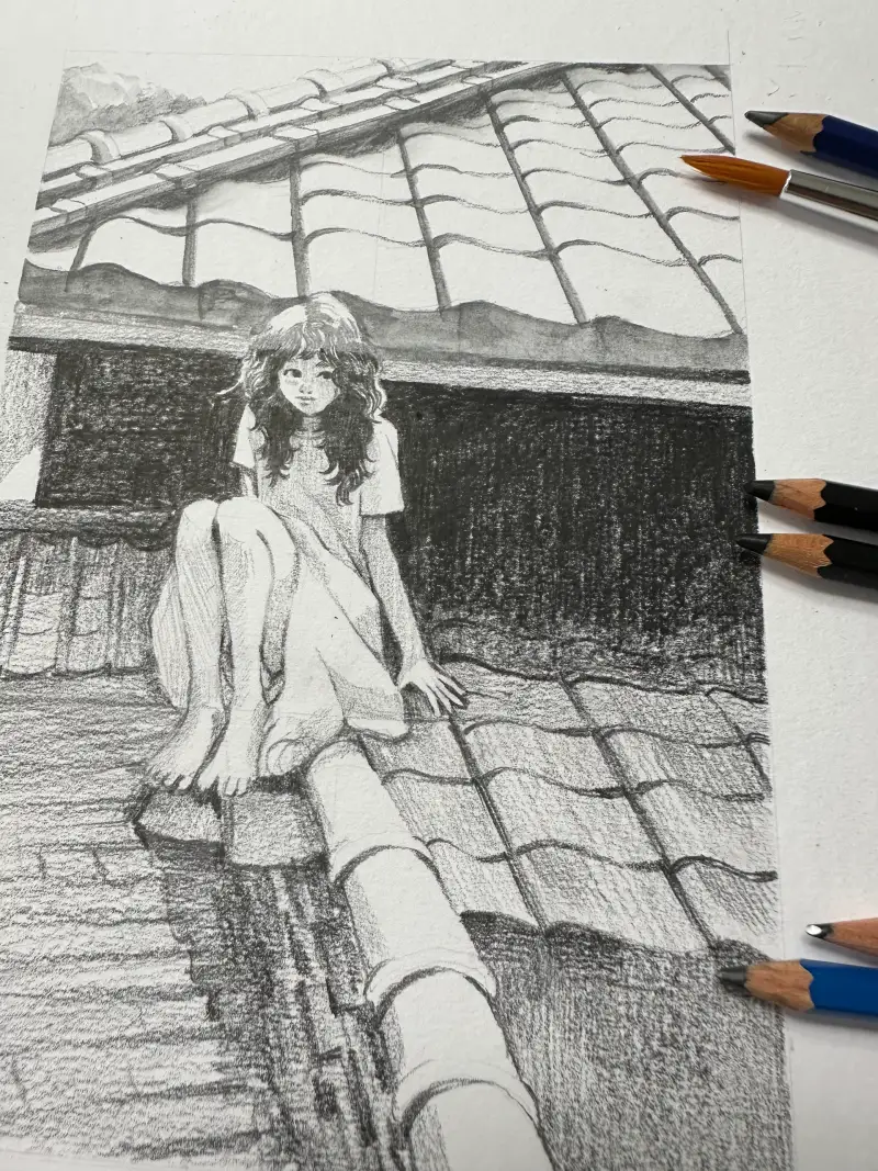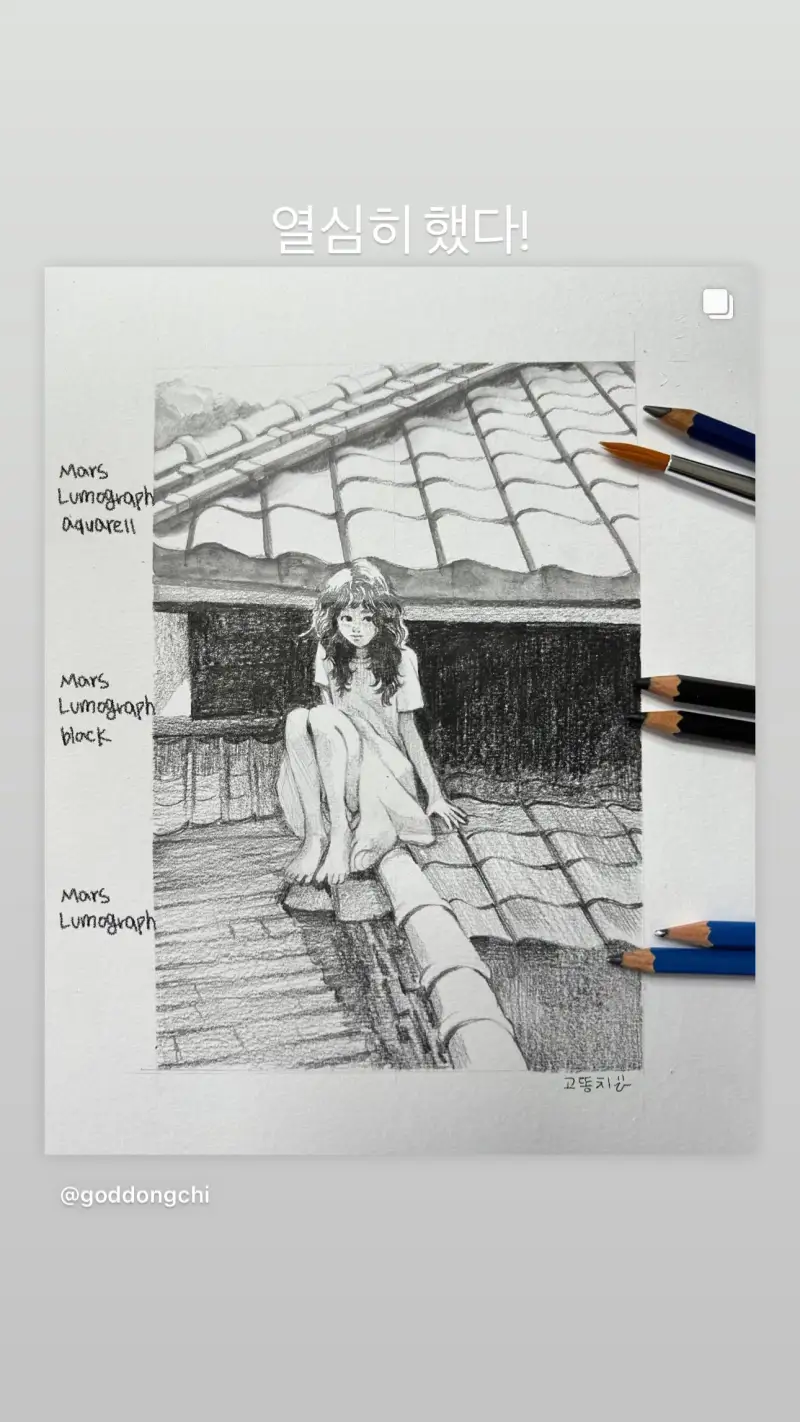 아쿠아렐 연필로 명암을 그린다음 물로 사샤삭하니 부드럽게 퍼지며 햇빛을 받은 기와지붕이 따뜻하게 표현되어 너무 좋았습니다.