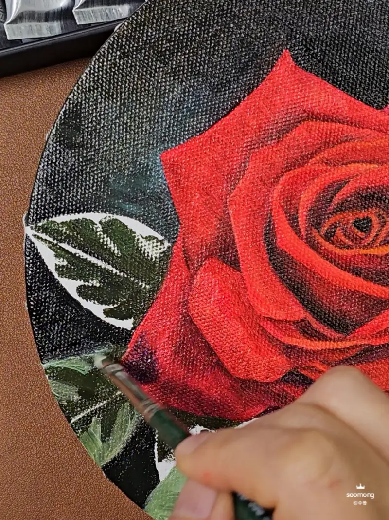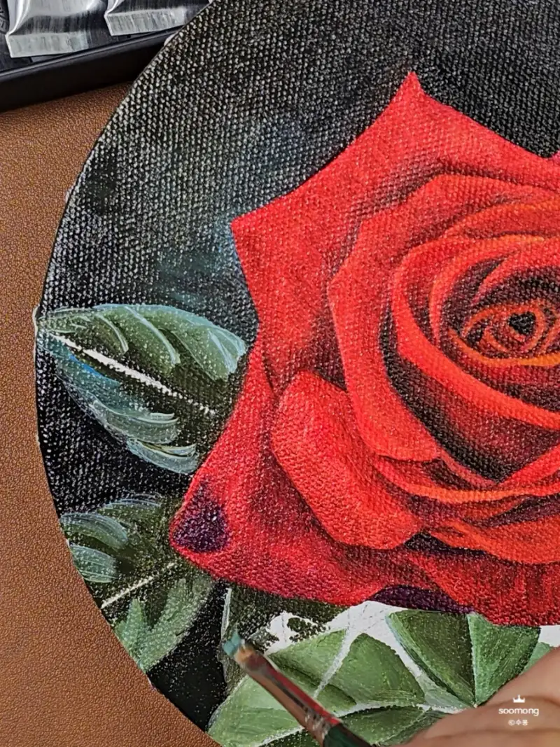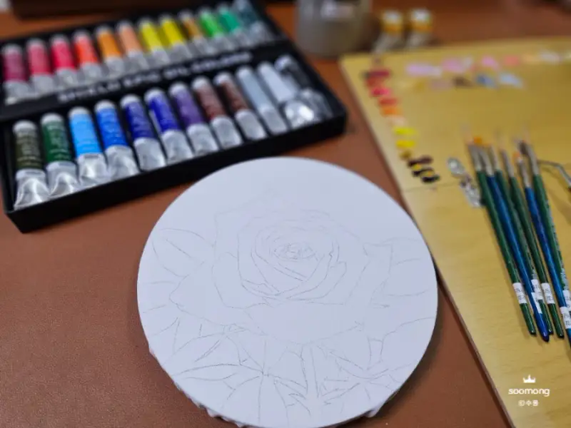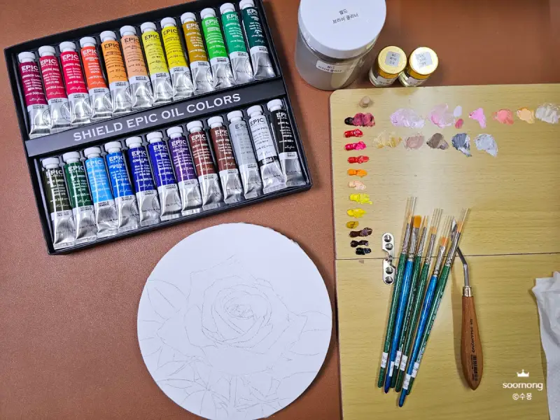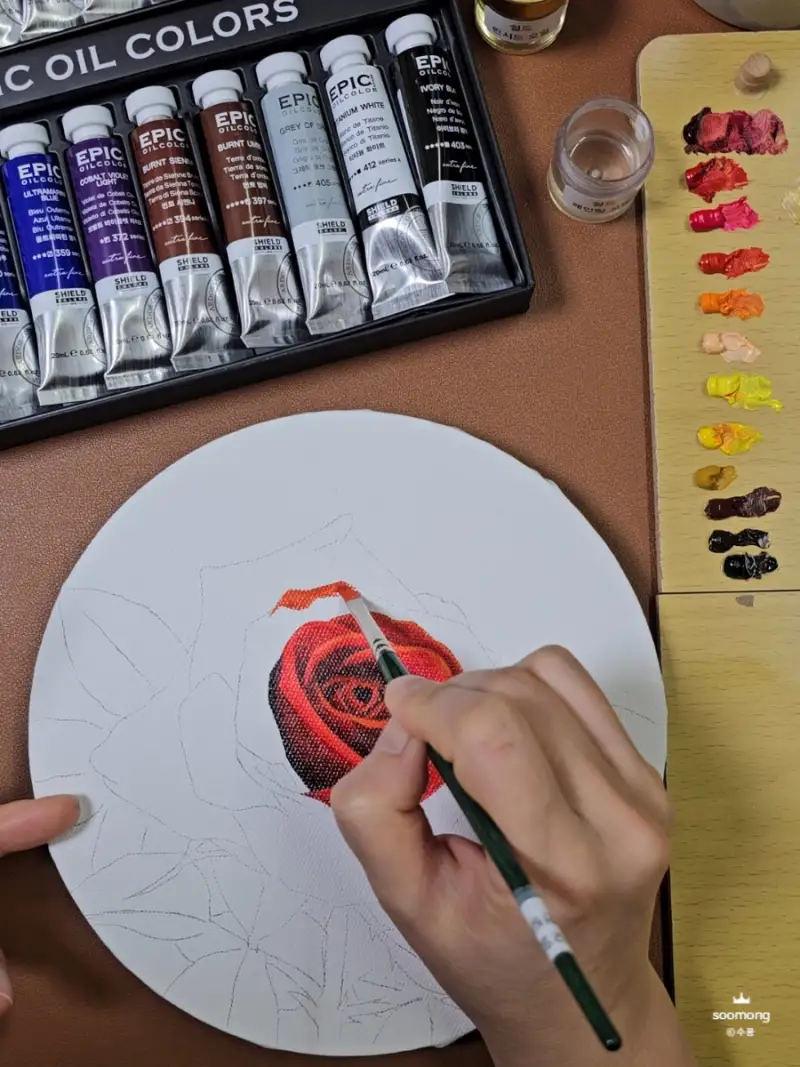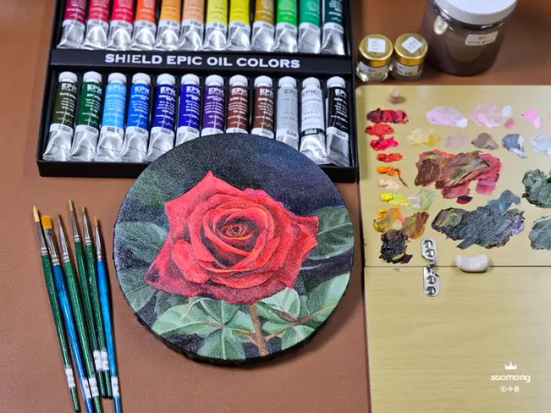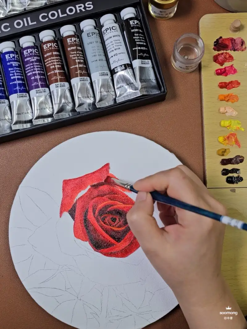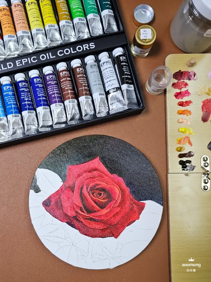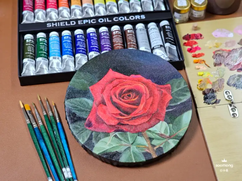 에픽 유화물감으로 색상을 칠해보며 느낀 점은 고급 안료로 제작되어 발색이 매우 뛰어나답니다. 고급스러운 장미의 색상이 잘 표현된답니다.