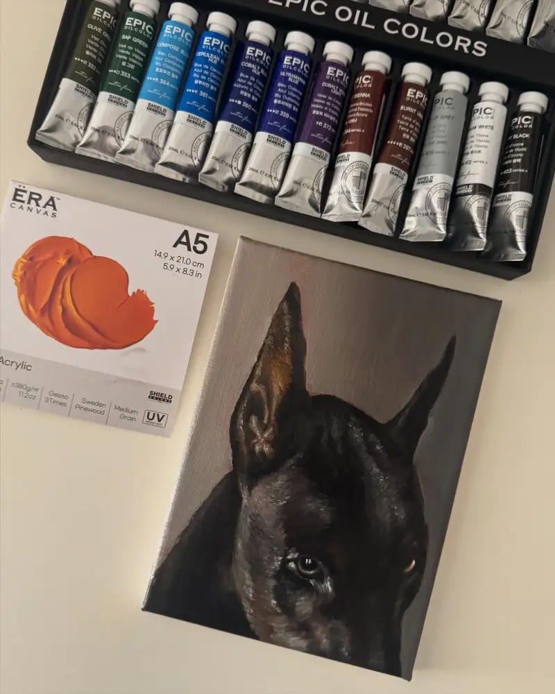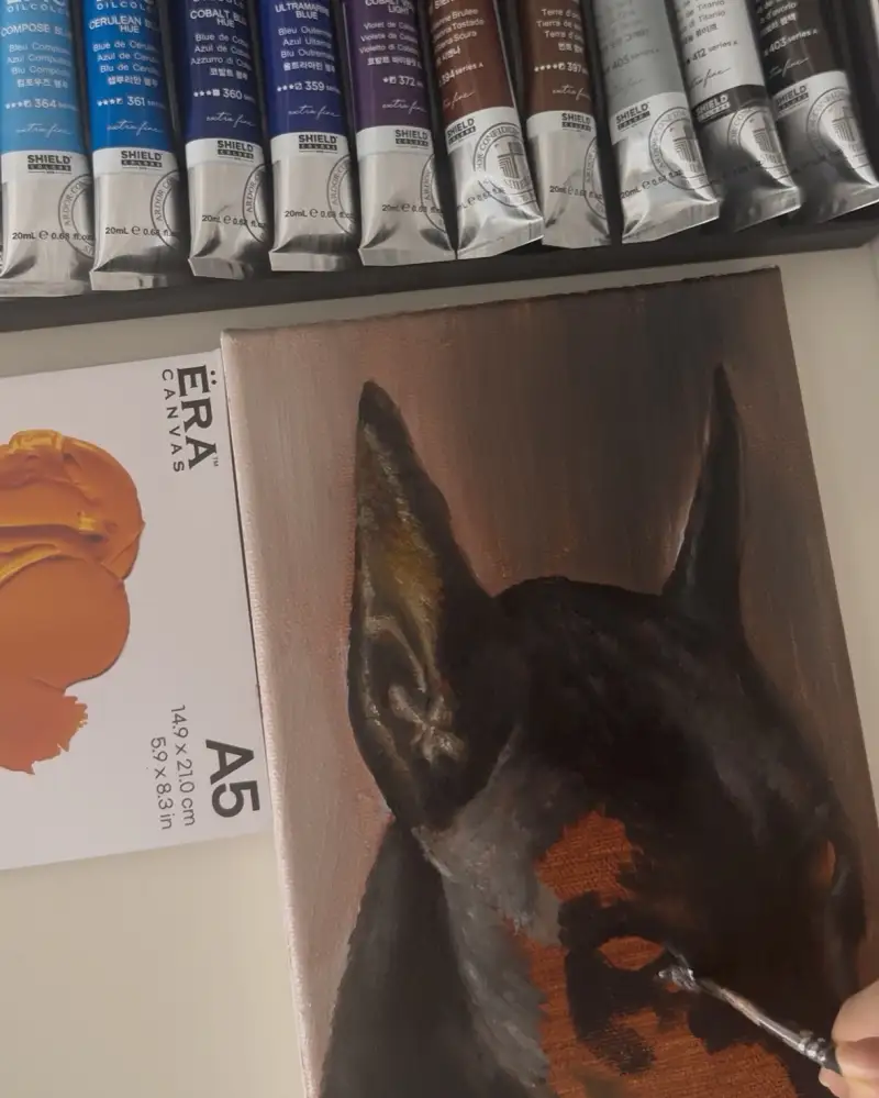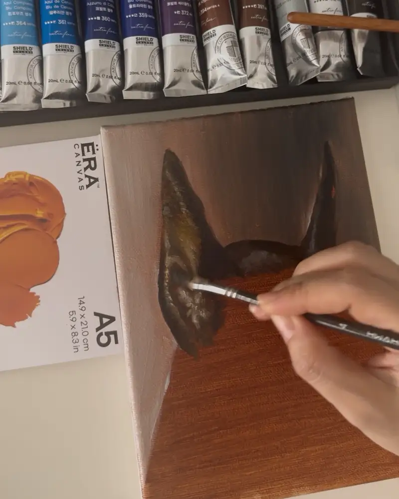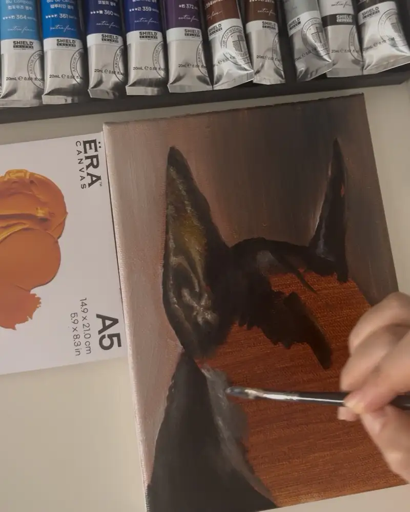 발색이 좋고 세트 구성이 딱 정석인 색들이라 섞어 사용하기에도 무리없어보였고요 ;-) 캔버스는 이미 젯소칠이 3번 되어있는 제품이라 그리는데 매우 편안했습니다. A5사이즈의 캔버스 그림은 1시간 반정도 소요..!