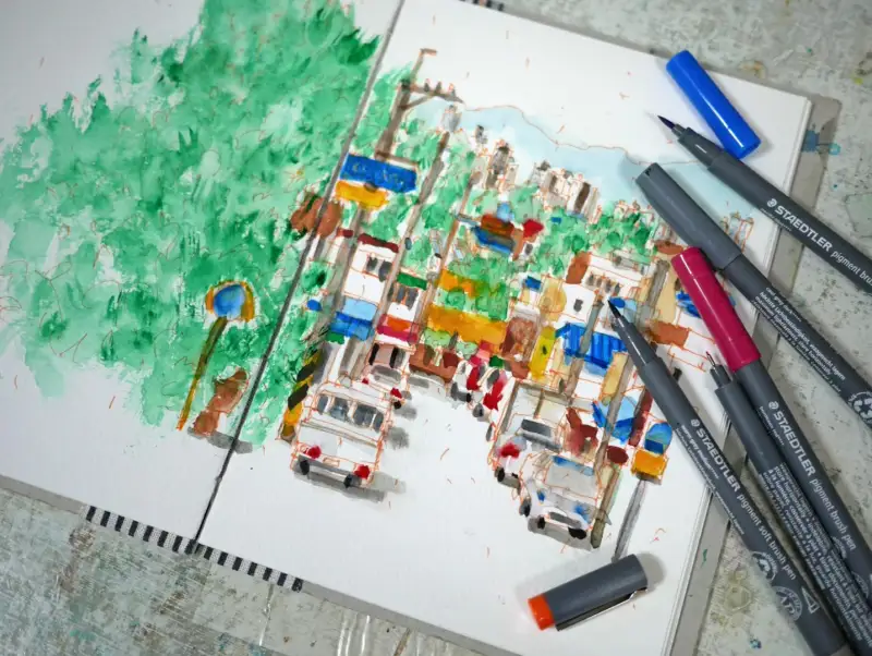 스테들러 피그먼트 브러쉬 펜은 물을 사용하여 바로 채색하면 번지고 지워지기 때문에 번지지 않게 하려면 시간을 좀 가지고 말린 후 물감 칠을 하는 것이 좋습니다.