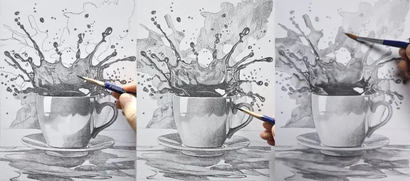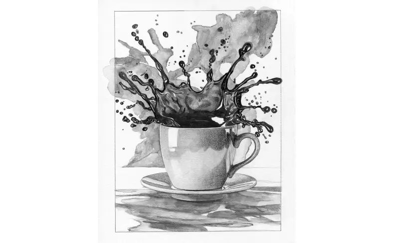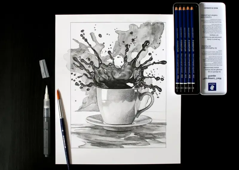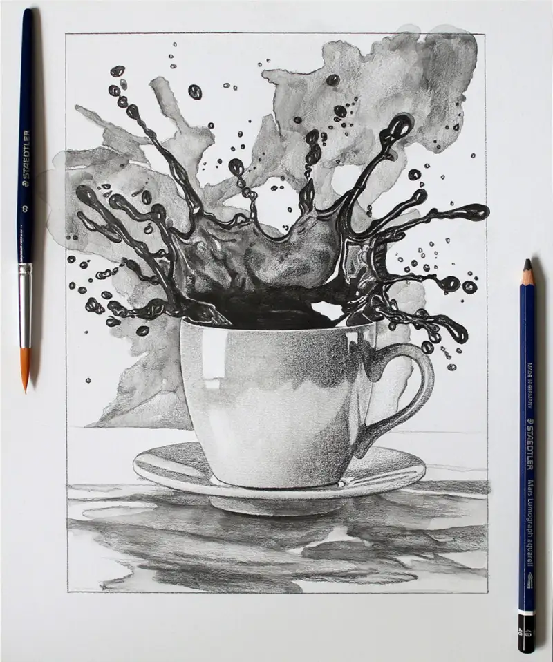 커피 방울이 튀는 모습은 연필로 작업 후 워터브러쉬와 붓을 사용해서 수채화 느낌으로 표현해 봤습니다.