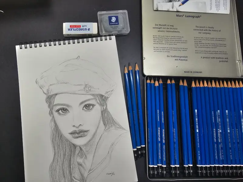 그릴 때 얼굴에 시선이 집중되게 눈, 코, 입에만 공을 들이는 스타일인데, 스테들러 마스루모그라프 100 24본조 연필을 사용해서 그리니 심등급이 다양해서 밀도 올리는 것이 쉽더라구요ㅎㅎ
