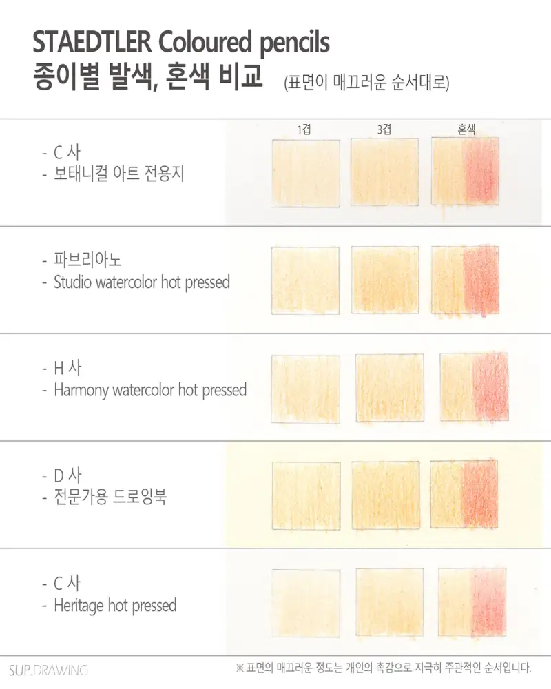 파브리아노 종이와 다이소 종이(캔트지로 추정되어 테스트함)가 발색과 혼색 정도가 비슷했는데,
