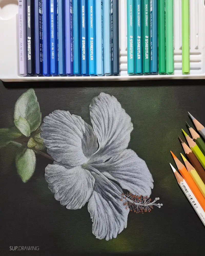 스테들러 소프트 유성색연필은 밝은류 색들이 흑지에서 비슷한 발색을 보여서 잘 어울려졌던것 같아요.