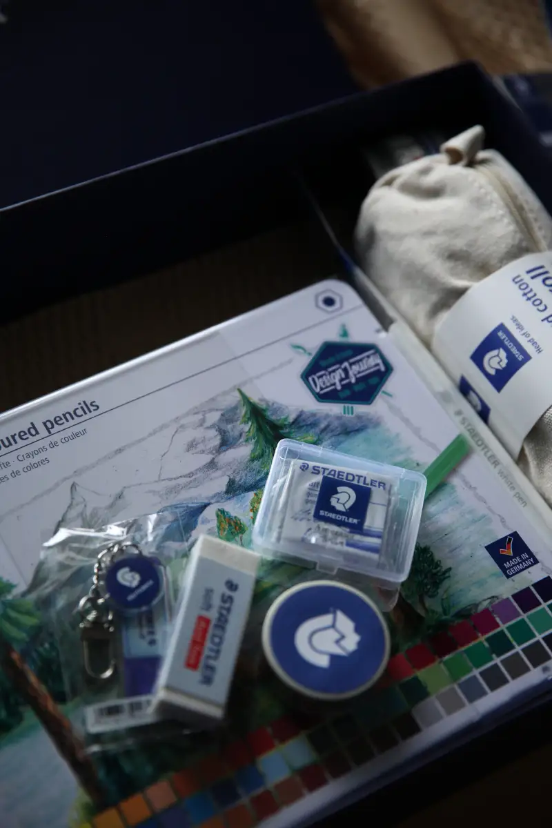 색연필뿐만이 아니고 연필세트, 화이트펜세트, 목수연필세트, 지우개 등등 많은 화구가 파란색 박스에 담겨져 왔어요.