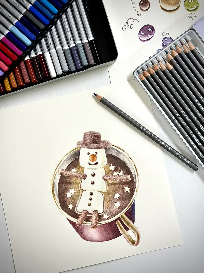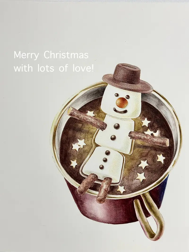 카라트 색연필로 하얀 마시멜로우 명암을 곱게 표현했고, 명확한 외곽라인 정리가 필요했던 초코 부분과 오돌도돌한 팔다리를 그려 볼 수 있었습니다.