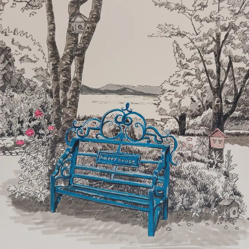 나무는 형태만 0.3mm 피그먼트 라이너 펜으로 잡아주고 웜그레이 라이트와 미디움 컬러를 사용해서 러프하게 칠해줬어요. 어두운 부분은 쿨그레이 다크 컬러로 칠하고, 위에 라이너펜으로 벗나무의 질감을 표현해 줬어요. 의자 아래부분의 그림자도 쓱싹쓱싹 칠했는데 명암을 쉽게 넣을 수 있어 너무 편했어요.