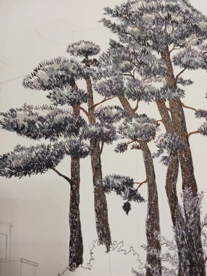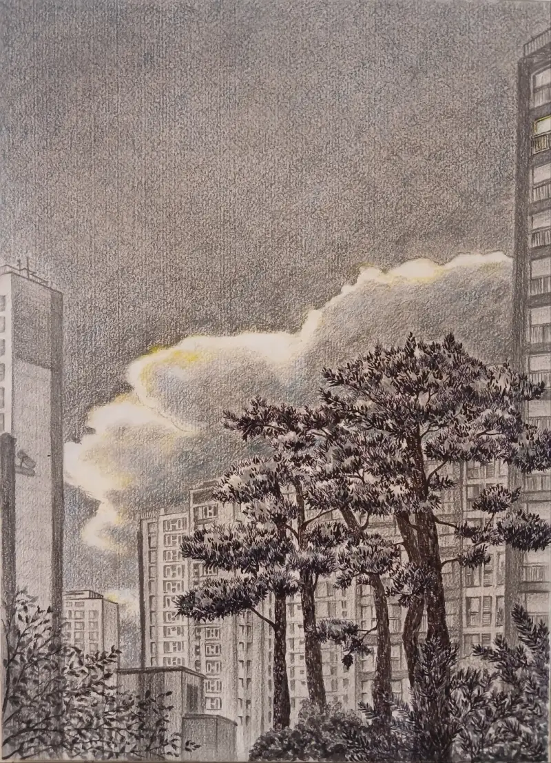 피그먼트 펜이 진하니까 연필과 함께 사용했을 때 앞의 소나무가 자연스럽게 강조가 되었어요.