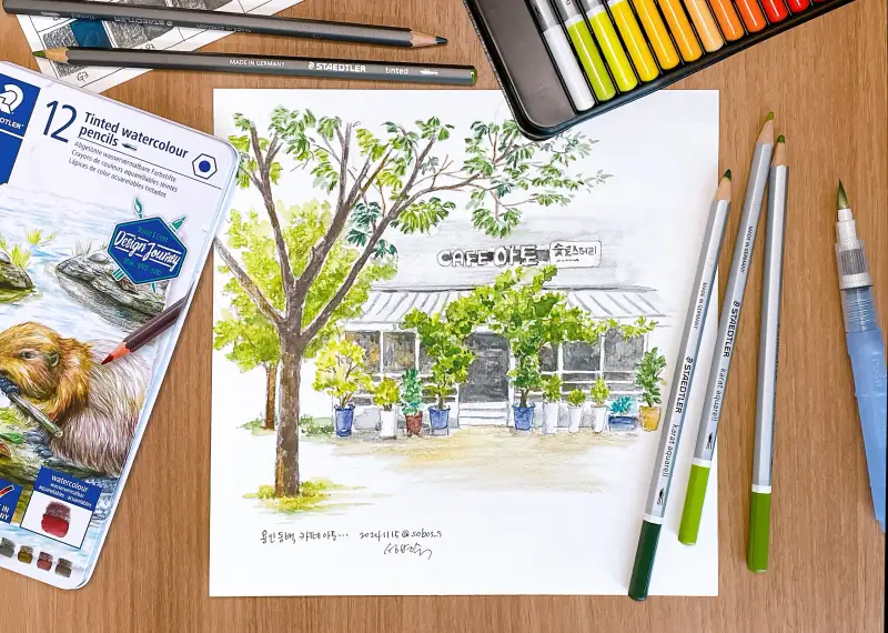 스테들러 카라트 수채 색연필과 틴트 색연필로 그린 카페