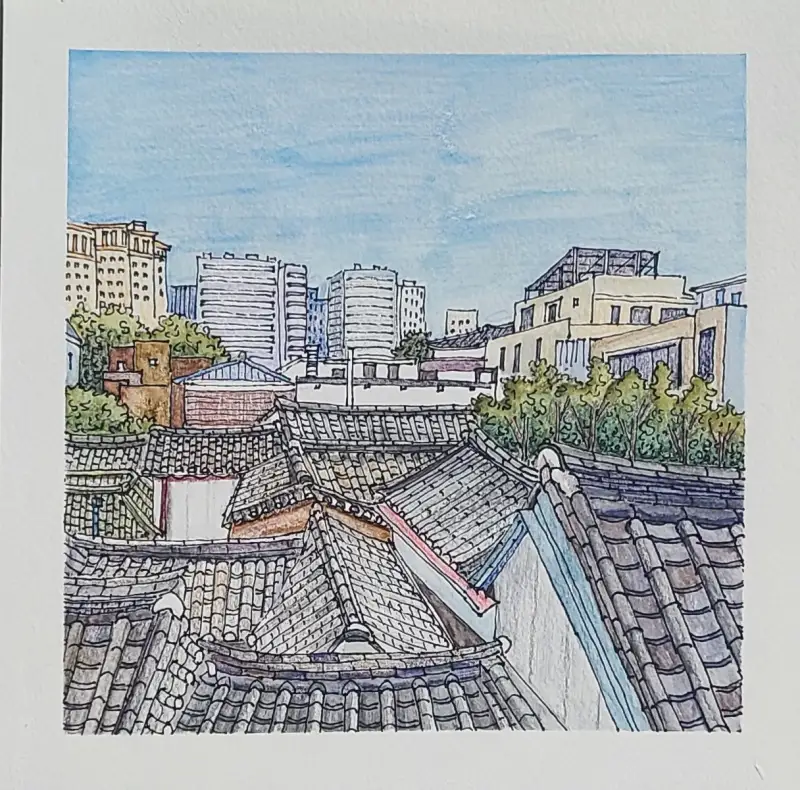 📌저는 틴트 색연필로 한옥풍경을 그려봤는데 특히 기와표현(G9, G83, G3, G73)하는데 적절했고, 숲은 (G1, G5)사용했습니다. 건물들은 색연필의 농도를 조절하면서 채색하니 좋았습니다.