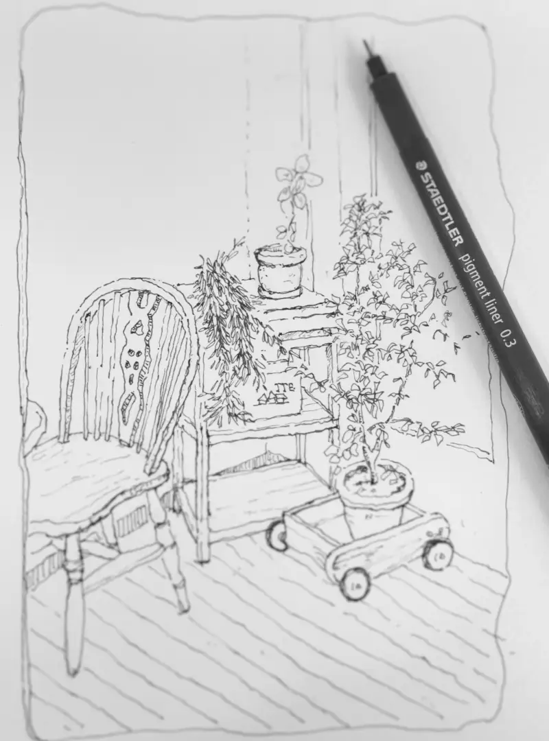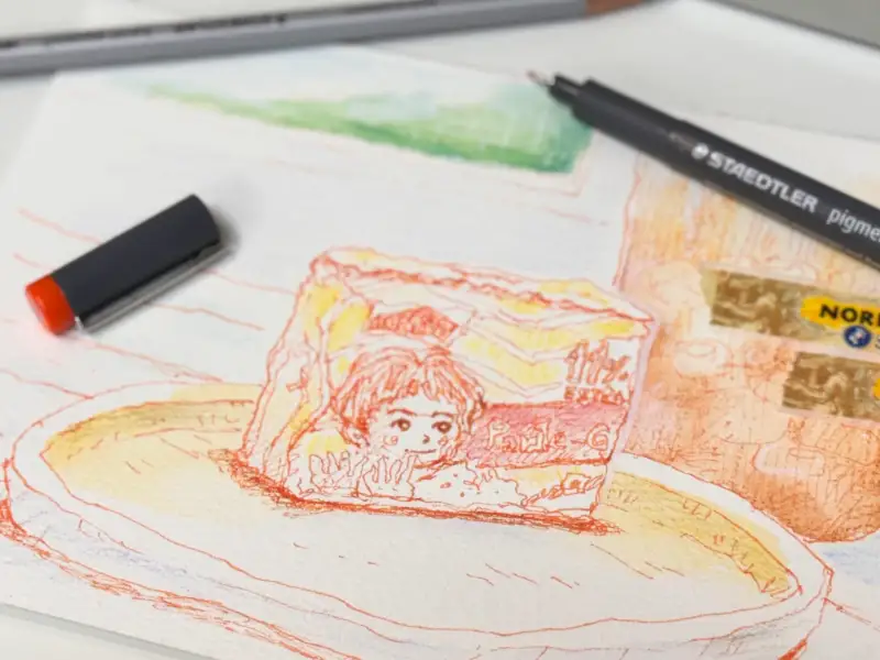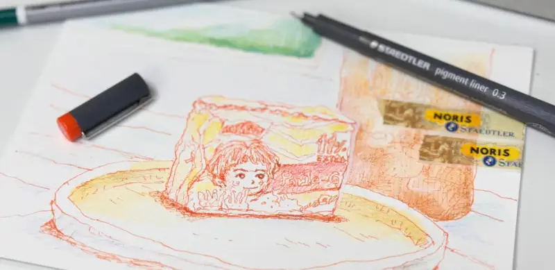 스테들러 피그먼트 라이너 오렌지색과 가지고 있는 스테들러 카라트 수채색연필로 색감도 넣어봤어요🎨